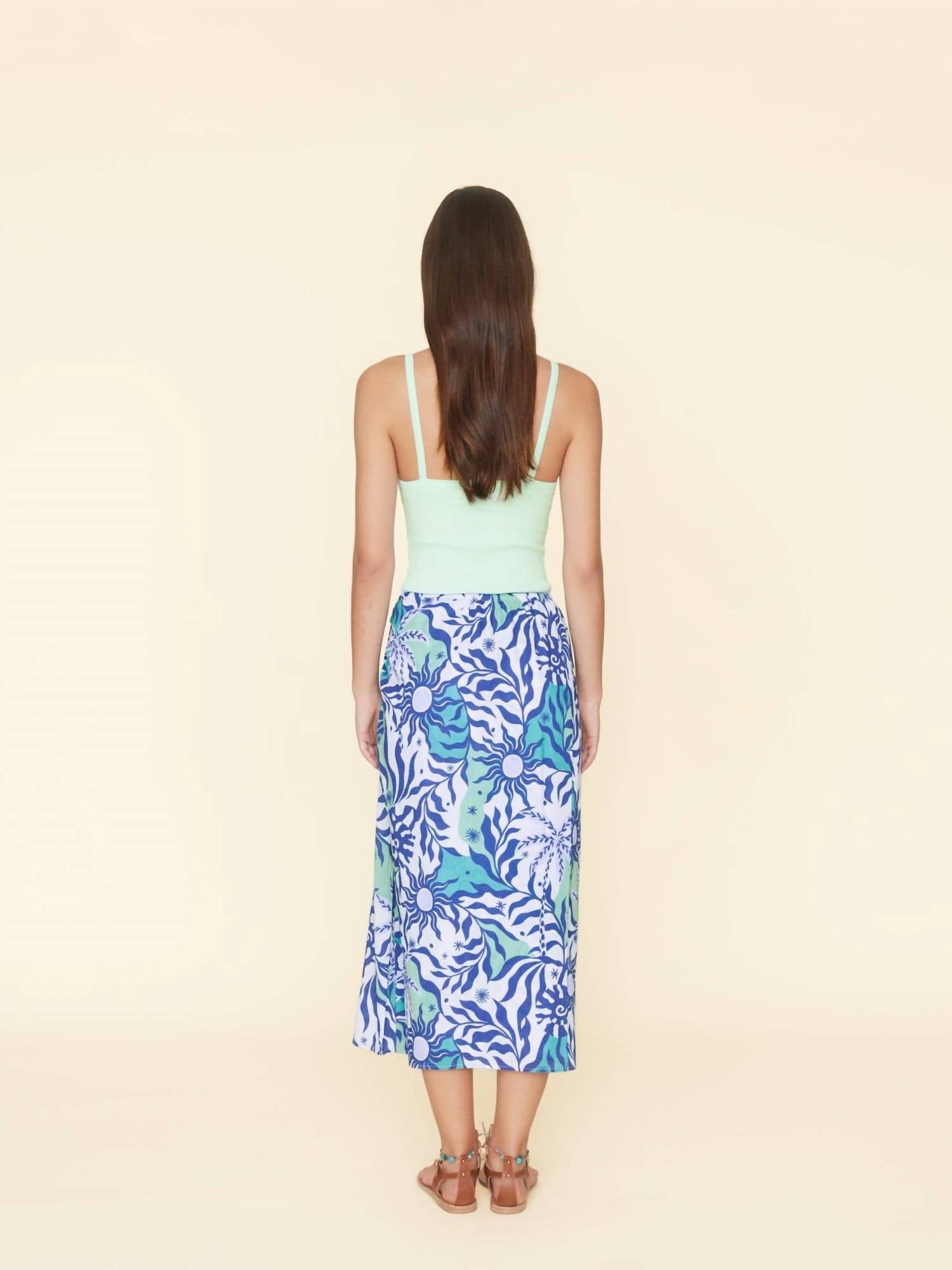 Flowy, comortable and stylish. This maxi skirt is a fan favorite. Cotton gauze print. Fully lined pull-on maxi skirt with a front drape waist, elasticized back waist, and front-slit hem. Helios Island Gauze Print | 100% Cotton. Care: Machine wash cold separately, hang to dry. Fit: True to size. Model is 5'9.5" and wears size Small. Designed in Los Angeles.