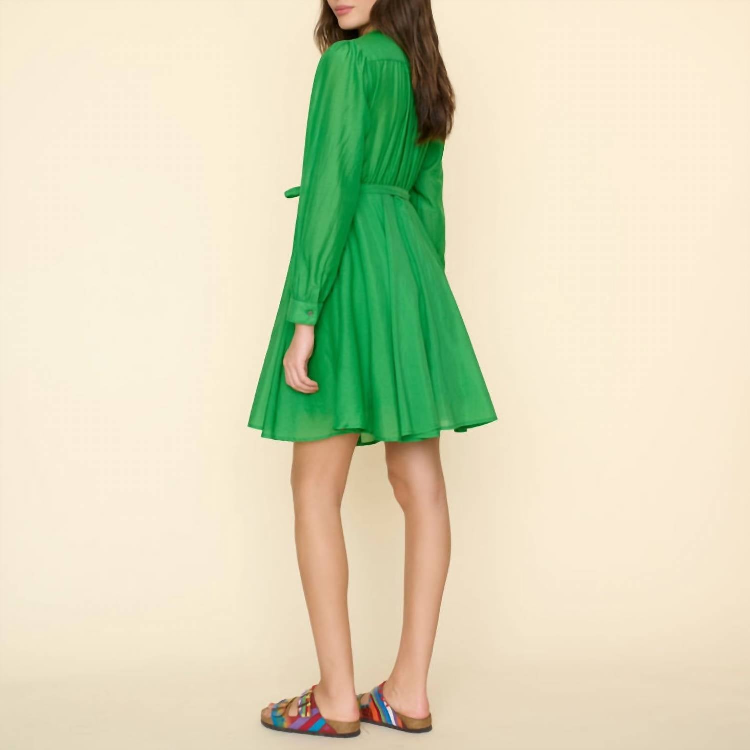 The perfect mini dress for those warmer months. Discover the Kinney Dress by XIRENA in a striking Jade Gem color, a perfect fusion of elegance and comfort for women. This mini A-line dress features long blouson sleeves with cotton cuffs and is crafted from a luxurious viole fabric composed of 70% cotton and 30% silk. Designed with a stylish V-neckline, it offers a practical tie closure, enhancing its effortless charm. This fully lined dress will be a sophisticated addition to your wardrobe, ideal for various occasions.