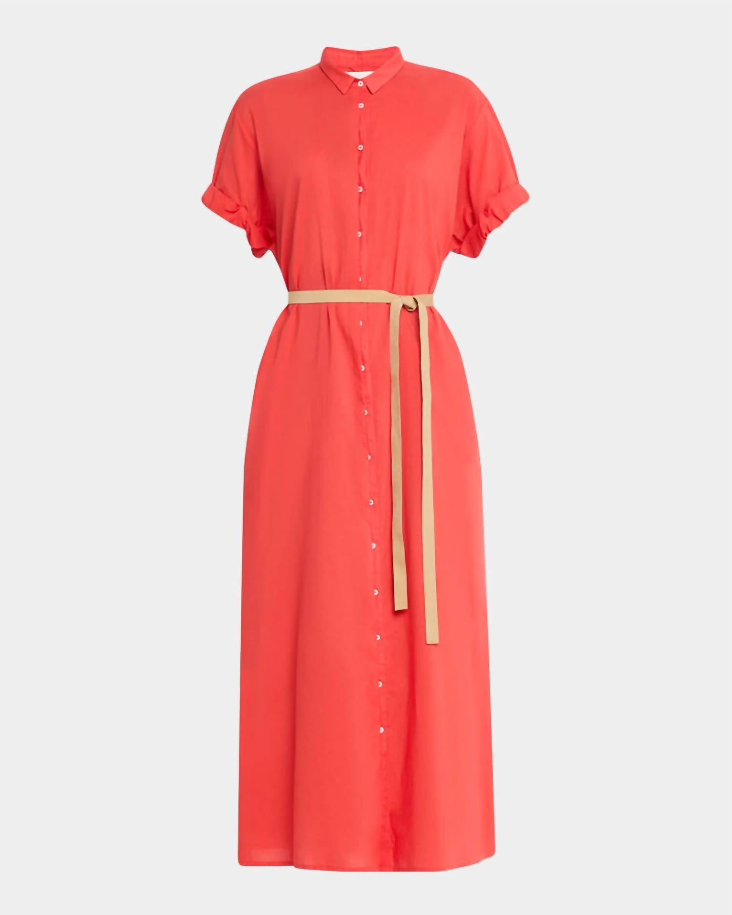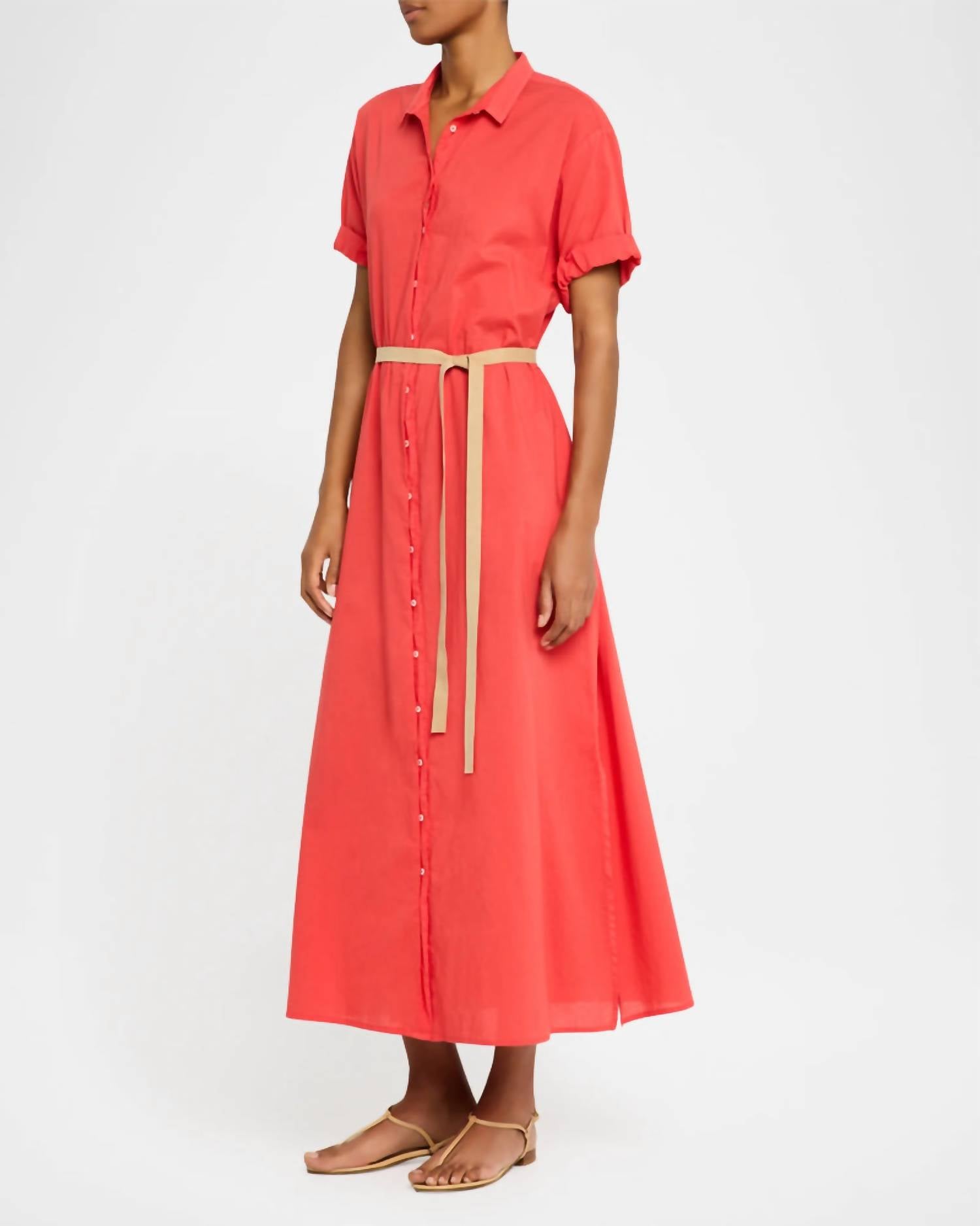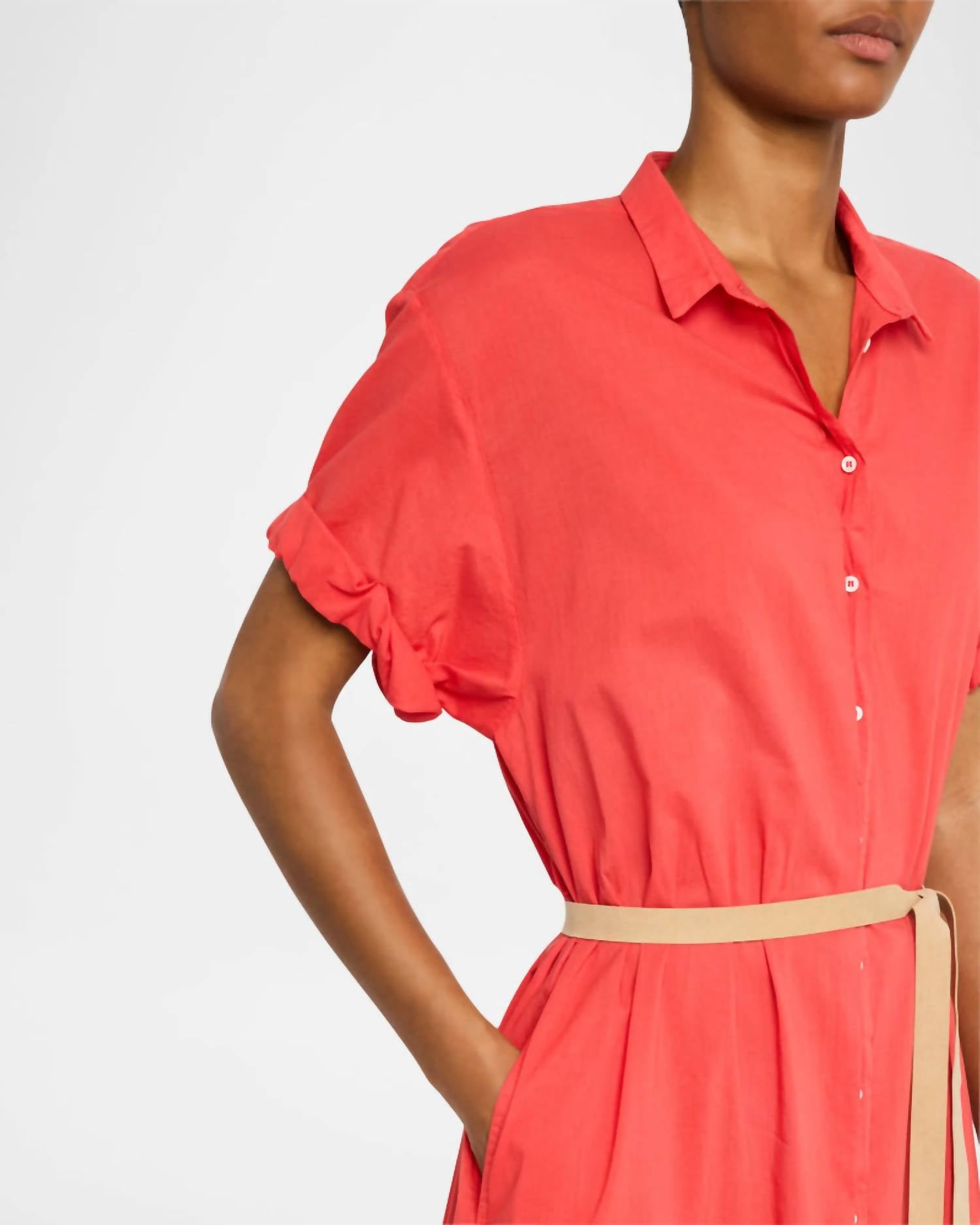Experience effortless elegance with the Linnet Maxi Dress by XIRENA, perfect for summer getaways. This women’s maxi dress features short sleeves and is crafted from 100% cotton poplin, offering a lightweight and breathable wear. Made in Los Angeles, it includes a button closure and a faux suede waist-tie, enhanced with side seam pockets and hem side slits for added styling versatility. Care for it easily with machine wash cold on a gentle cycle, followed by laying flat to dry. Model is 5'10" and wears a size small.