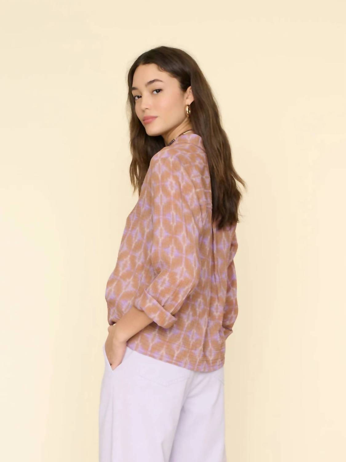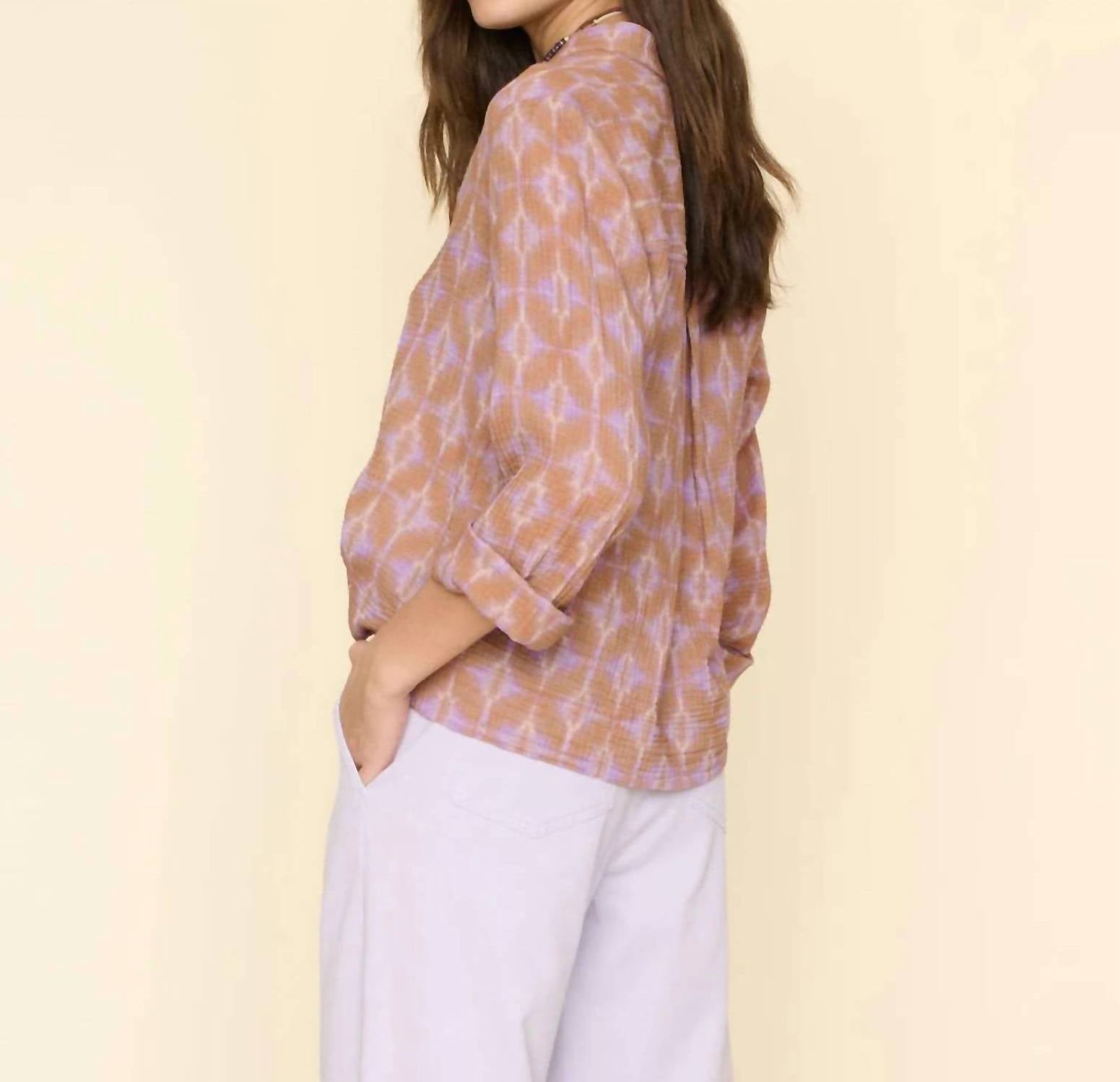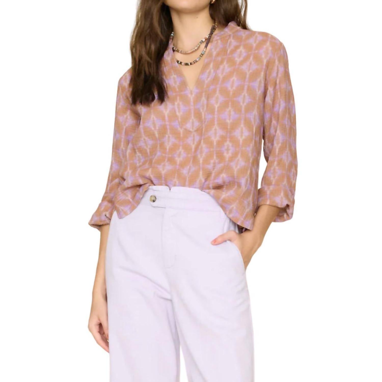 Featured in abstract cotton gauze geode print. Easy pullover top features a V-neck, stitched front yoke, wide sleeves, back yoke with released pleat, and a straight high low hem. Fabric: Geode Gauze Print | 100% Cotton. Machine wash cold, gentle cycle, lay flat to dry. True to size. Designed in US.