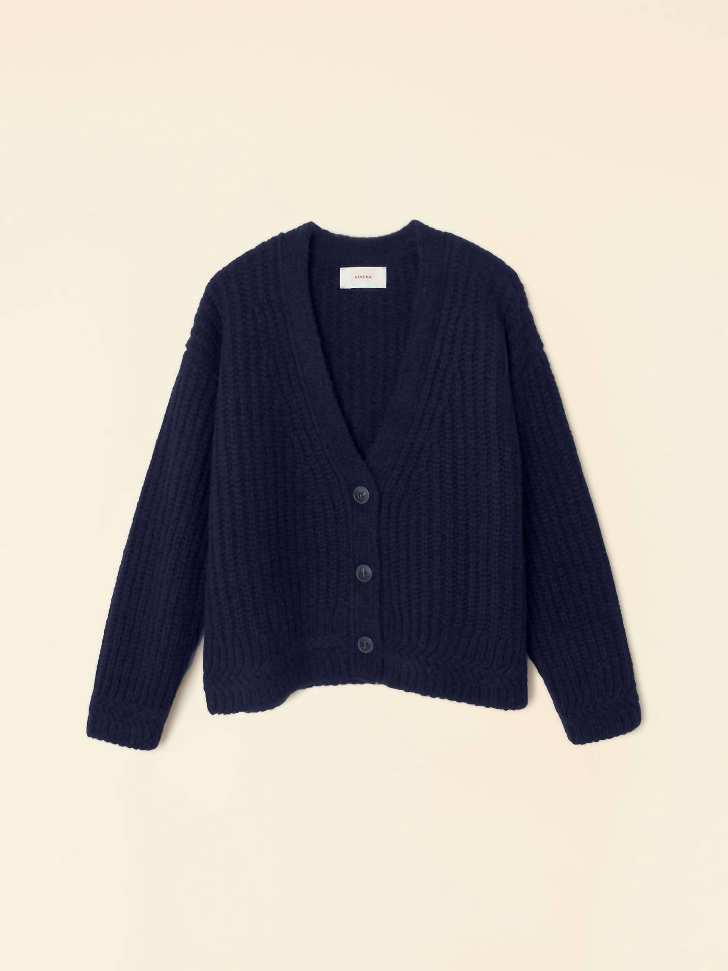 Throw this adorable cardigan over any cami or tank top. Introducing the Milli Cardigan by XIRENA, a stylish Navy Blue winter essential perfect for Back To School occasions. This long sleeve cardigan is crafted from a premium wool blend, featuring 55% Baby Alpaca, 24% Polyamide, and 21% Merino Wool for ultimate warmth and a textured appearance. Designed with a cropped length and a deep V-neck, it offers a flattering fit with a ribbed hem and cuffs. Closure: Button closure. Care: Dry clean only. Model is 5'10" and wears size S.