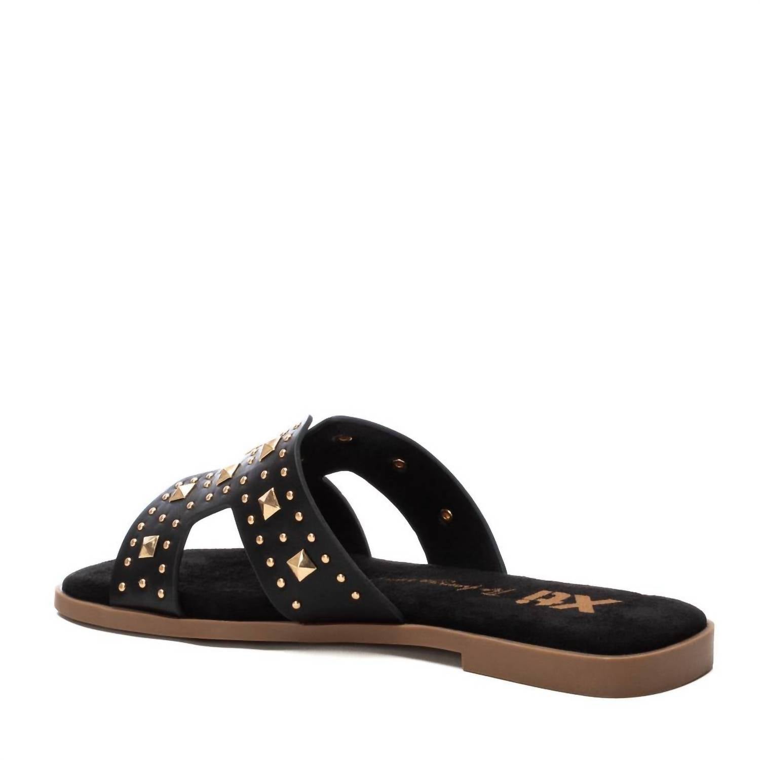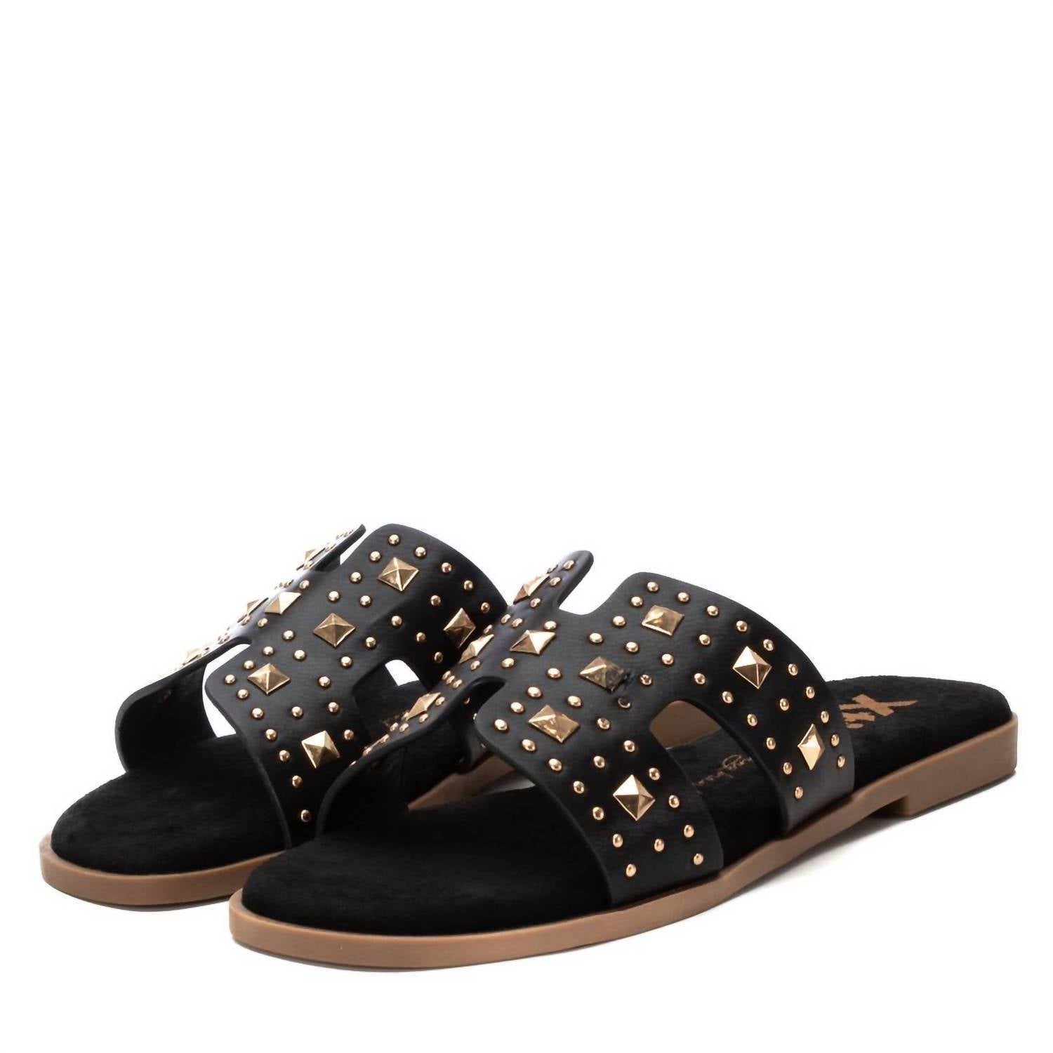 Flowy dresses, cropped pants, and even jumpsuits... this sandal works with them all! Introducing the Women's Casual Flat Sandals by Xti, the perfect blend of comfort and trendiness in a sleek black hue. These sandals are crafted from durable faux leather and feature a timeless round toe, making them ideal for any occasion. Heel style is flat with a heel height under 1 inch, providing all-day wearability. Designed specifically for women, these sandals effortlessly elevate your style while ensuring comfort.