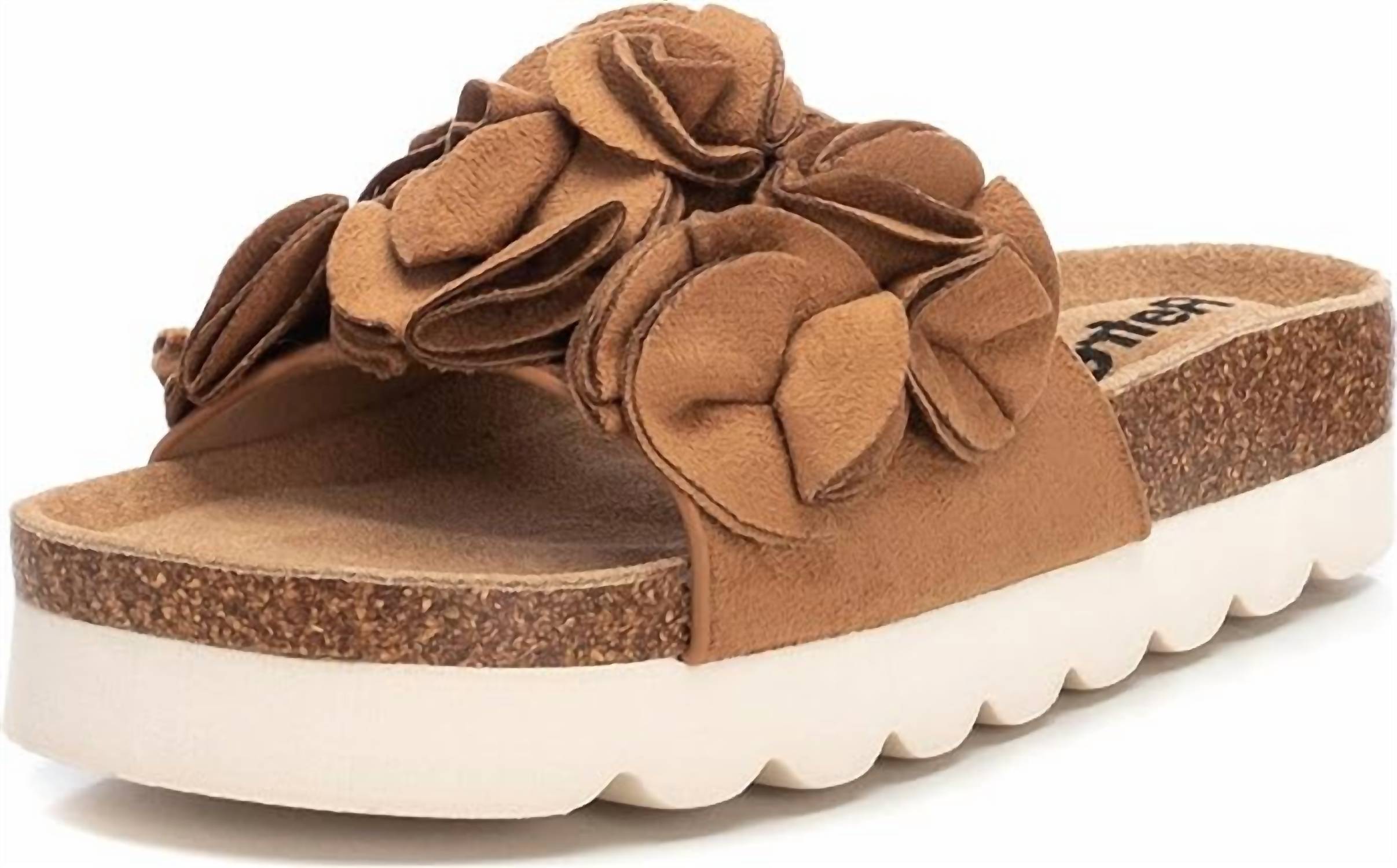 Classicly cute and all-day-wearable. We love this sandal. This Women's Sandals is crafted from soft suede, featuring a chic shovel design adorned with delicate decorative flowers. Boasts a flat bios sole crafted from split leather for comfort. The thick, non-slip sole. Round-toe.
