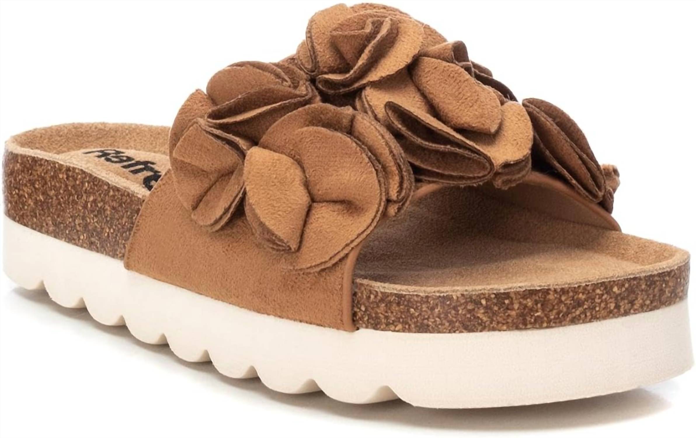 This Women's Sandals is crafted from soft suede, featuring a chic shovel design adorned with delicate decorative flowers. Boasts a flat bios sole crafted from split leather for comfort. The thick, non-slip sole. Round-toe.