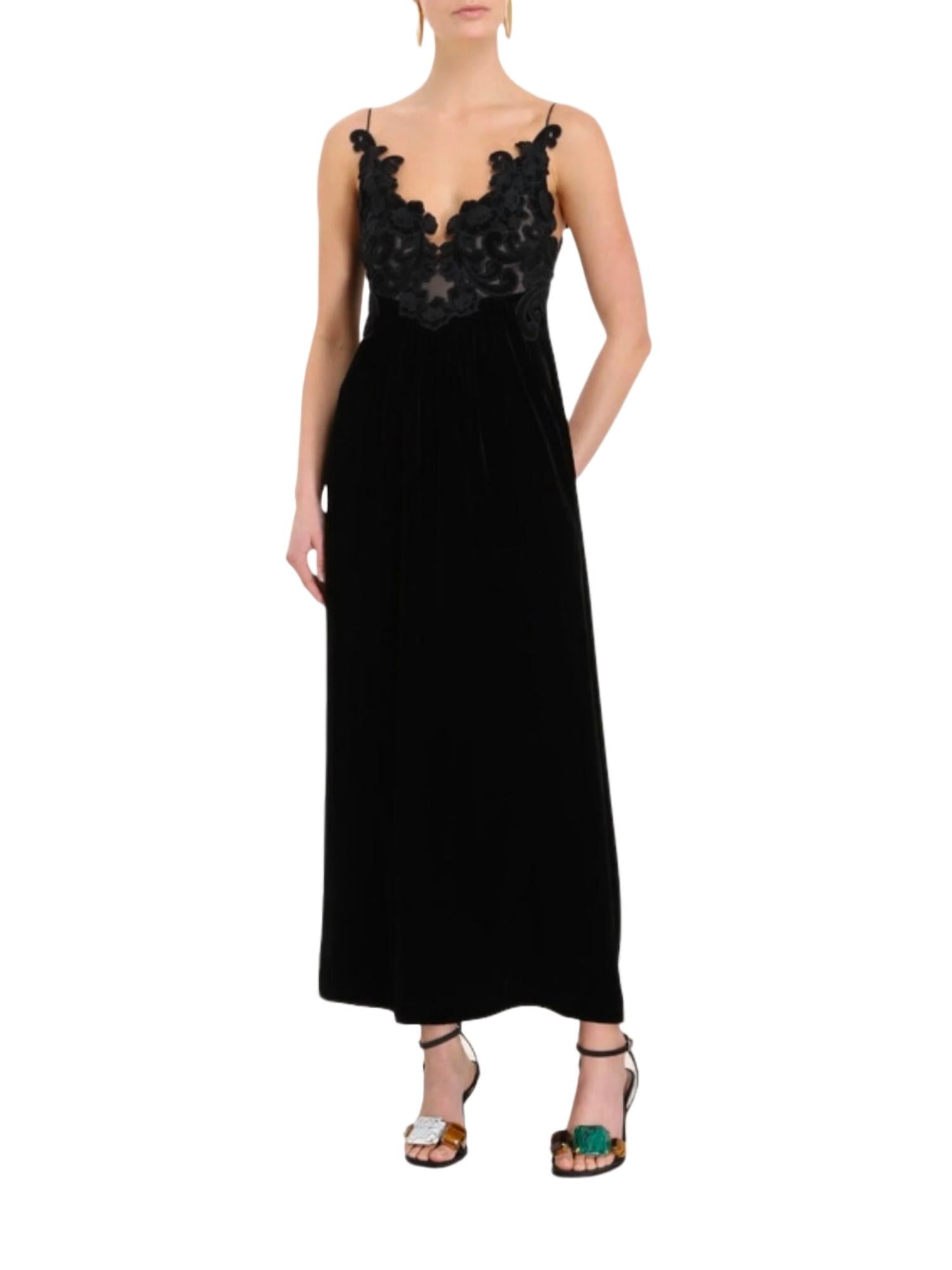 A midi dress so versatile, your options for wearing it are endless. Features an intricate cut-out bodice in a floral scroll motif. It has delicate spaghetti straps, side seam pockets, a plunging V-neck, and a concealed back-zip closure. The dress is made of 80% viscose and 20% silk. Dry clean only. Imported.