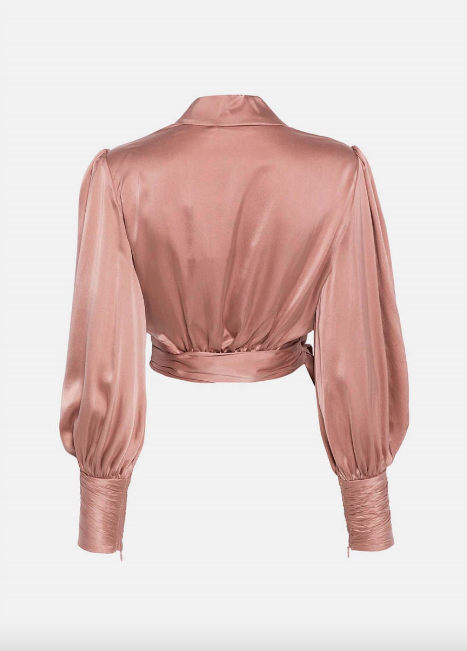 A timeless blouse that will never go out of style. Elevate your evening ensemble with the Silk Wrap Top by Zimmermann, a stunning piece in a blush hue. This top showcases a luxurious satin finish, long sleeves with cuff zips, and a chic shawl collar that beautifully frames the plunge neckline. Crafted from 100% silk, its wrap design and straight hem offer a sophisticated cropped silhouette, perfect for quiet luxury on special occasions.