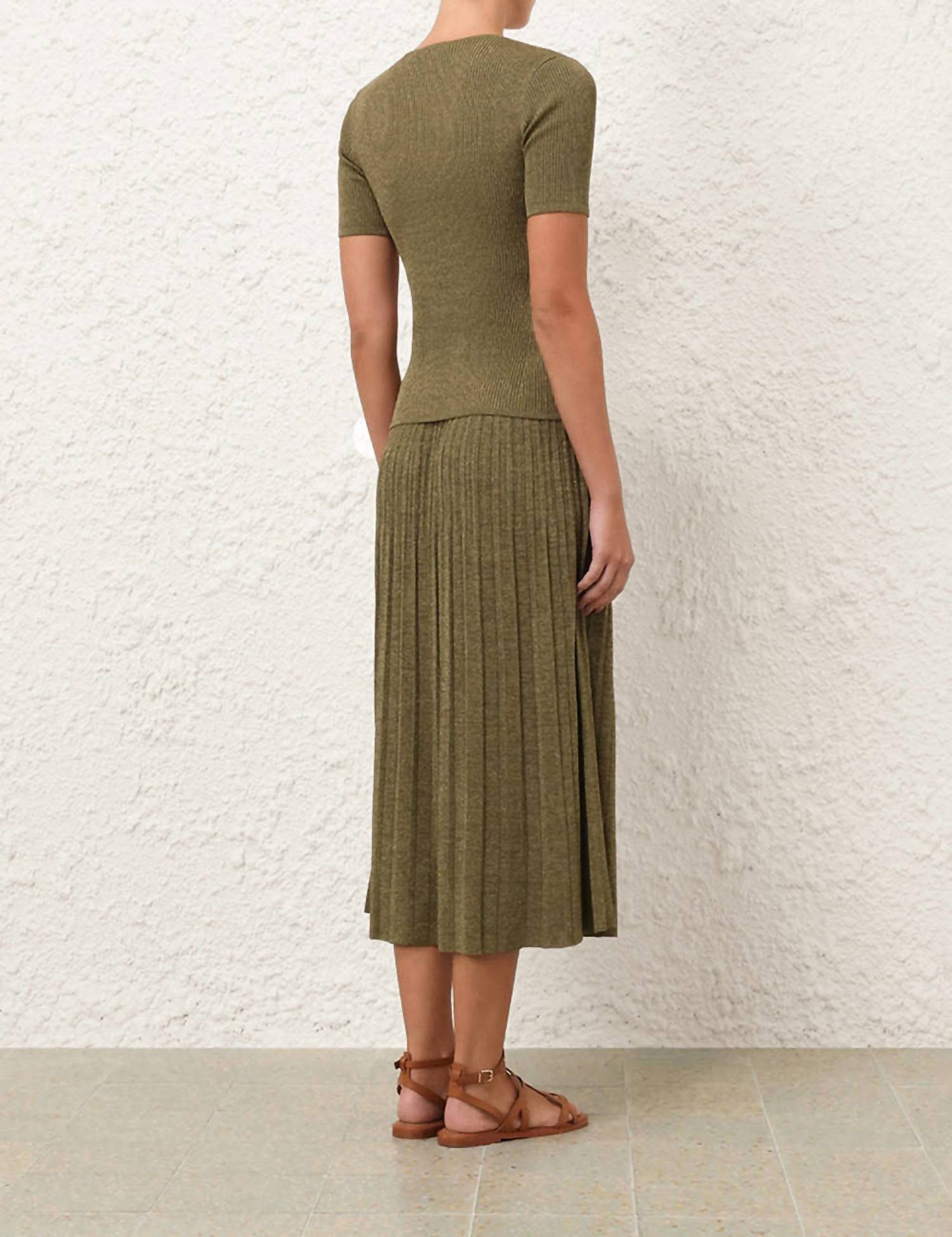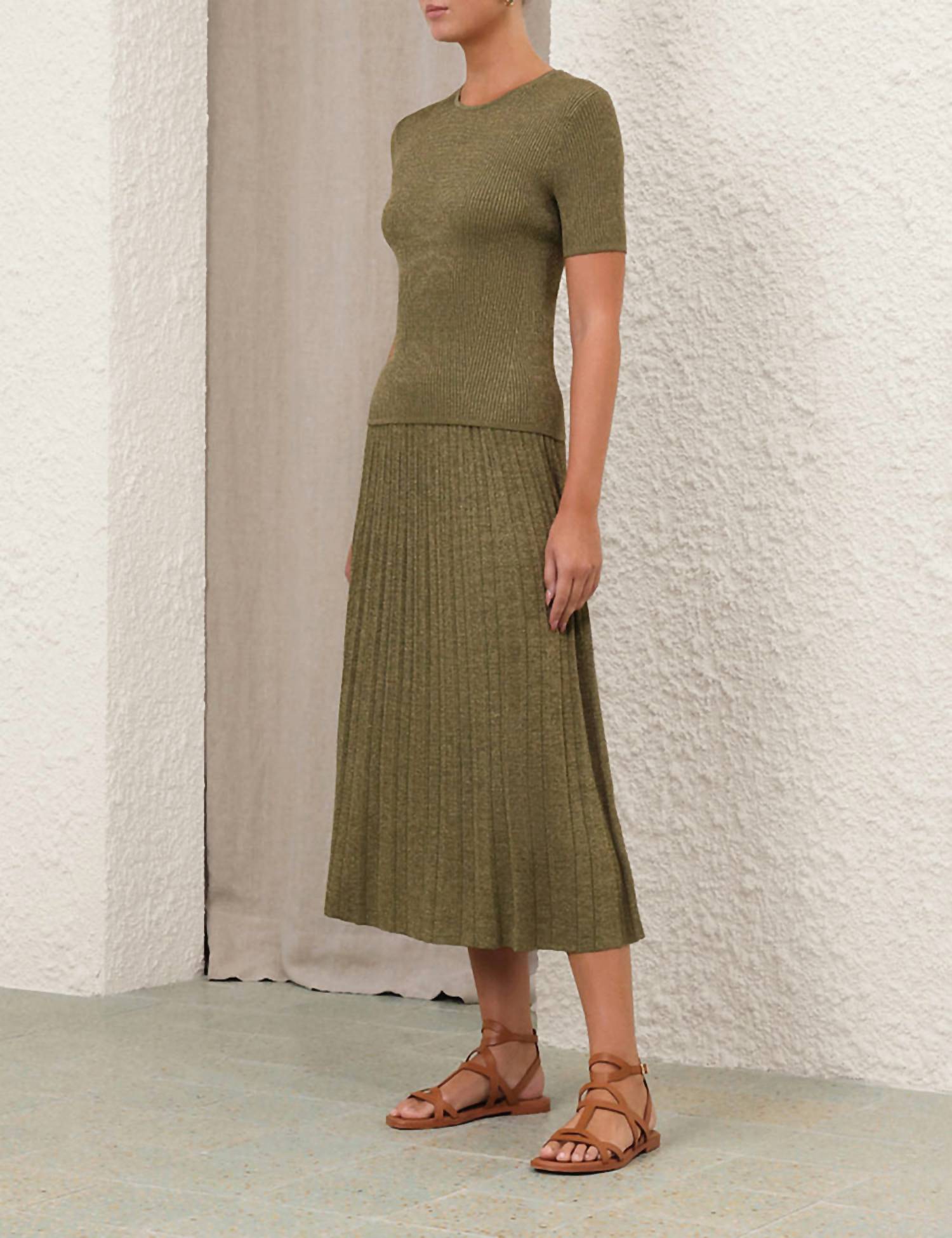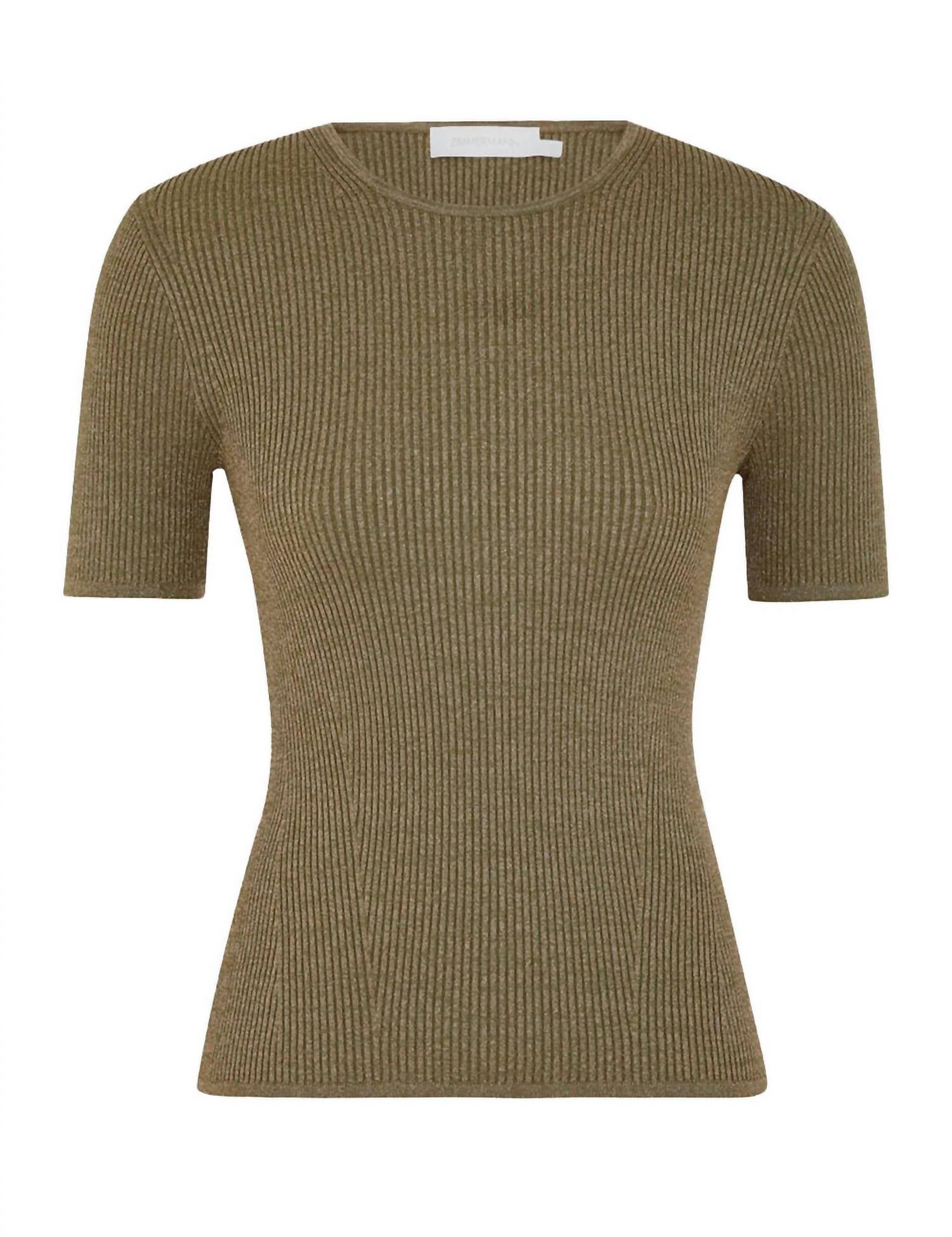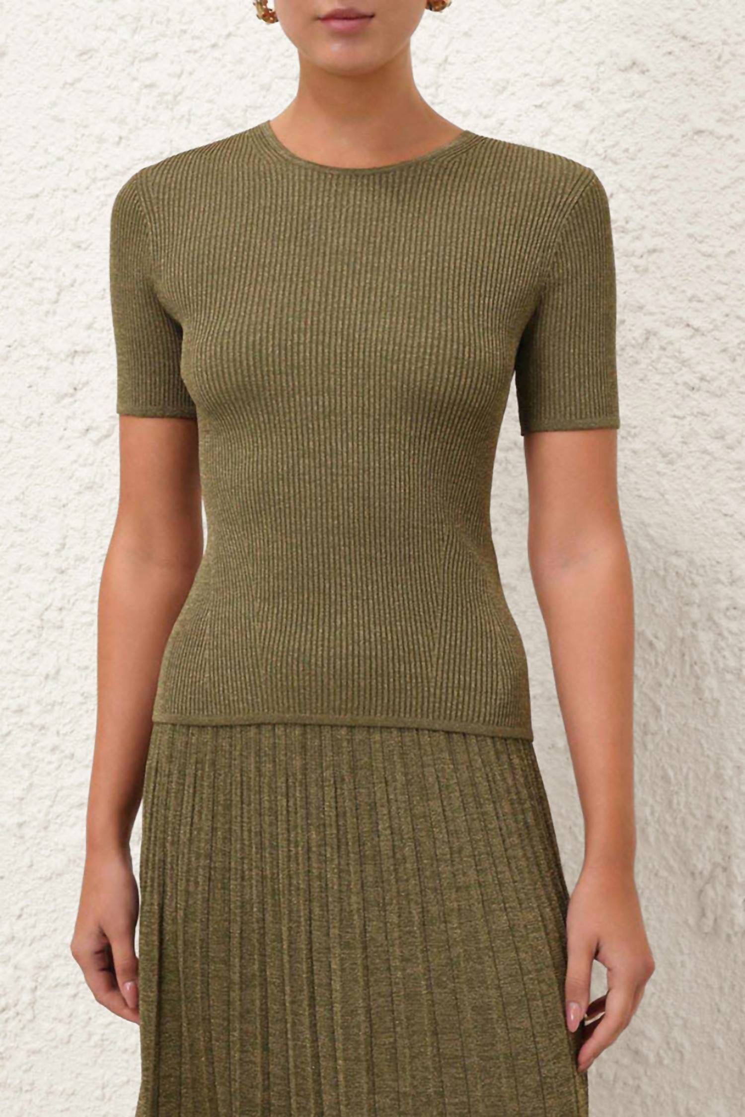 Introducing the Wylie Rib T-Shirt by Zimmermann, a stylish choice for your wardrobe in an eye-catching Dusty Olive-Gold. This crewneck tee showcases short sleeves with a trendy tie-dye pattern, making it perfect for summer or music festivals. Crafted from a luxurious blend of 64% Viscose, 29% Polyamide, and 7% Metallized Fiber, it offers a comfortable true-to-size fit. Closure: Pull on.
