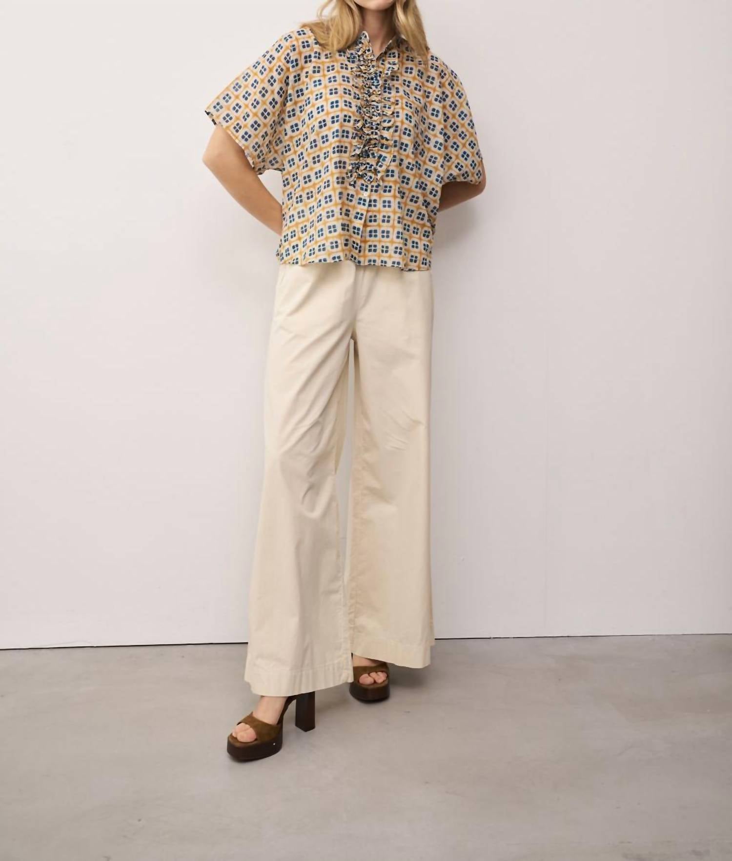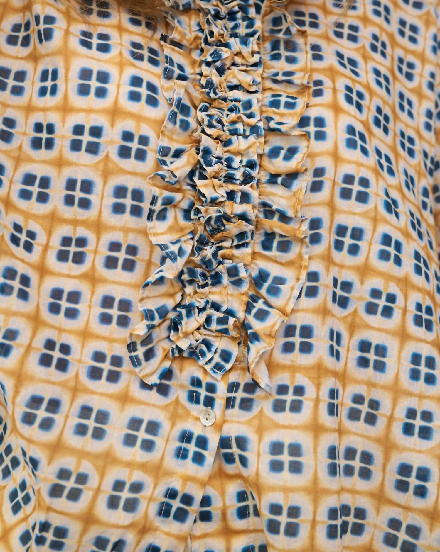 Meet the Short Sleeve Ruffle Front Blouse by 0039 Italy, a vibrant addition to your wardrobe with its eye-catching geometric pattern in cheerful yellow. Crafted from 100% cotton, this piece offers three-quarter sleeves and features a playful ruffle detail at the front for a feminine charm. The elegant stand-up collar and full-length button closure complete this stylish design. Care: Machine wash.