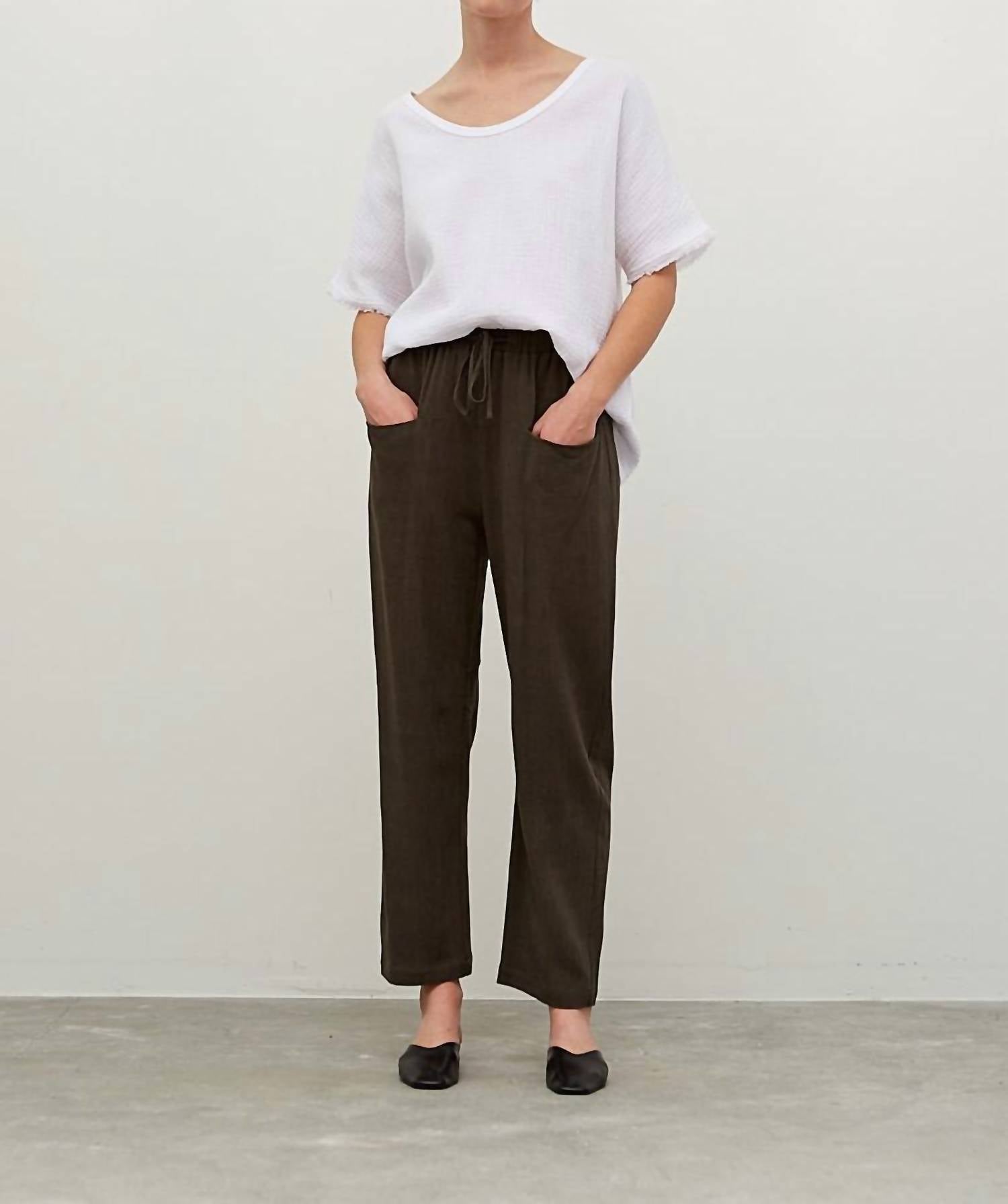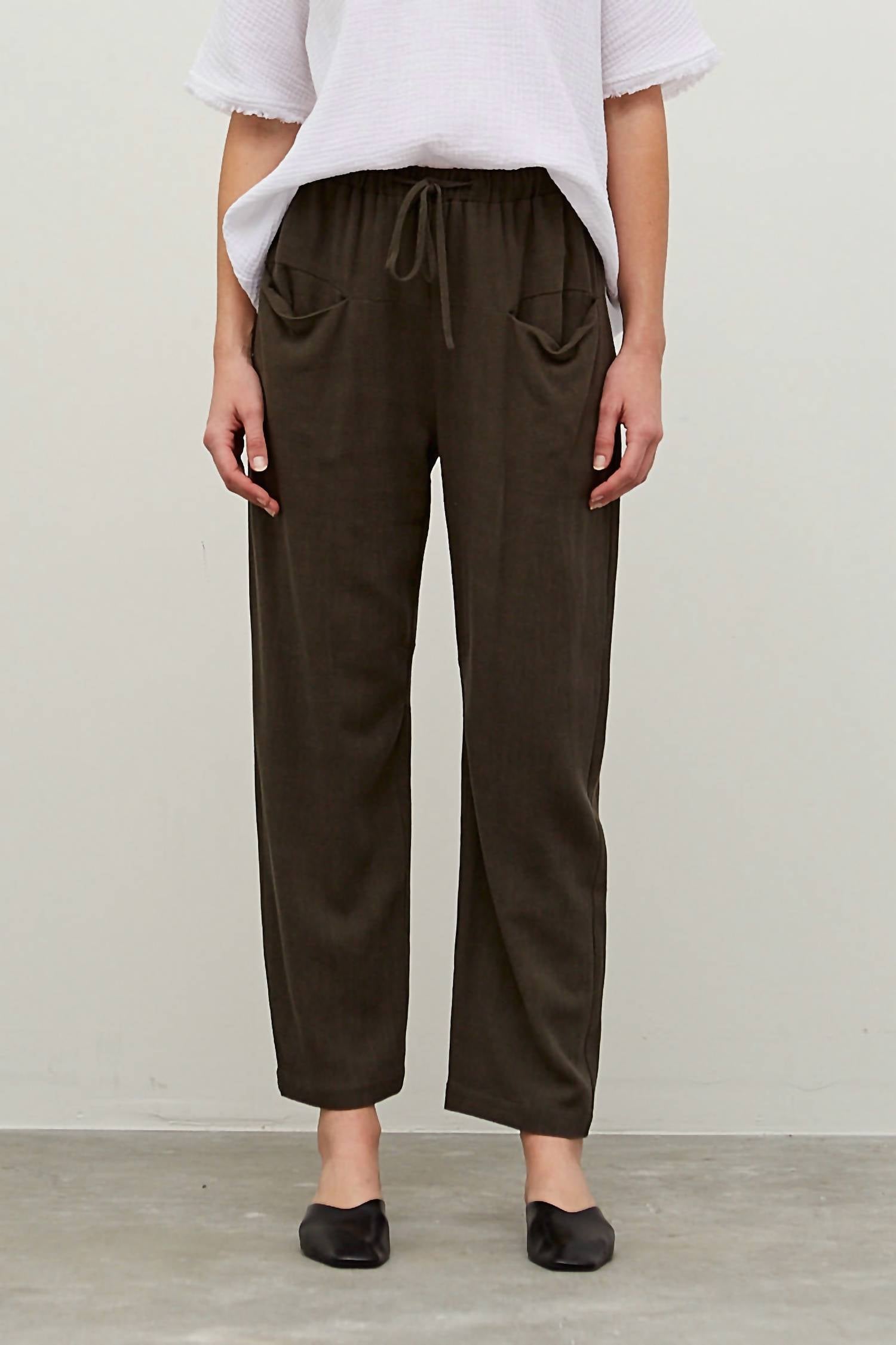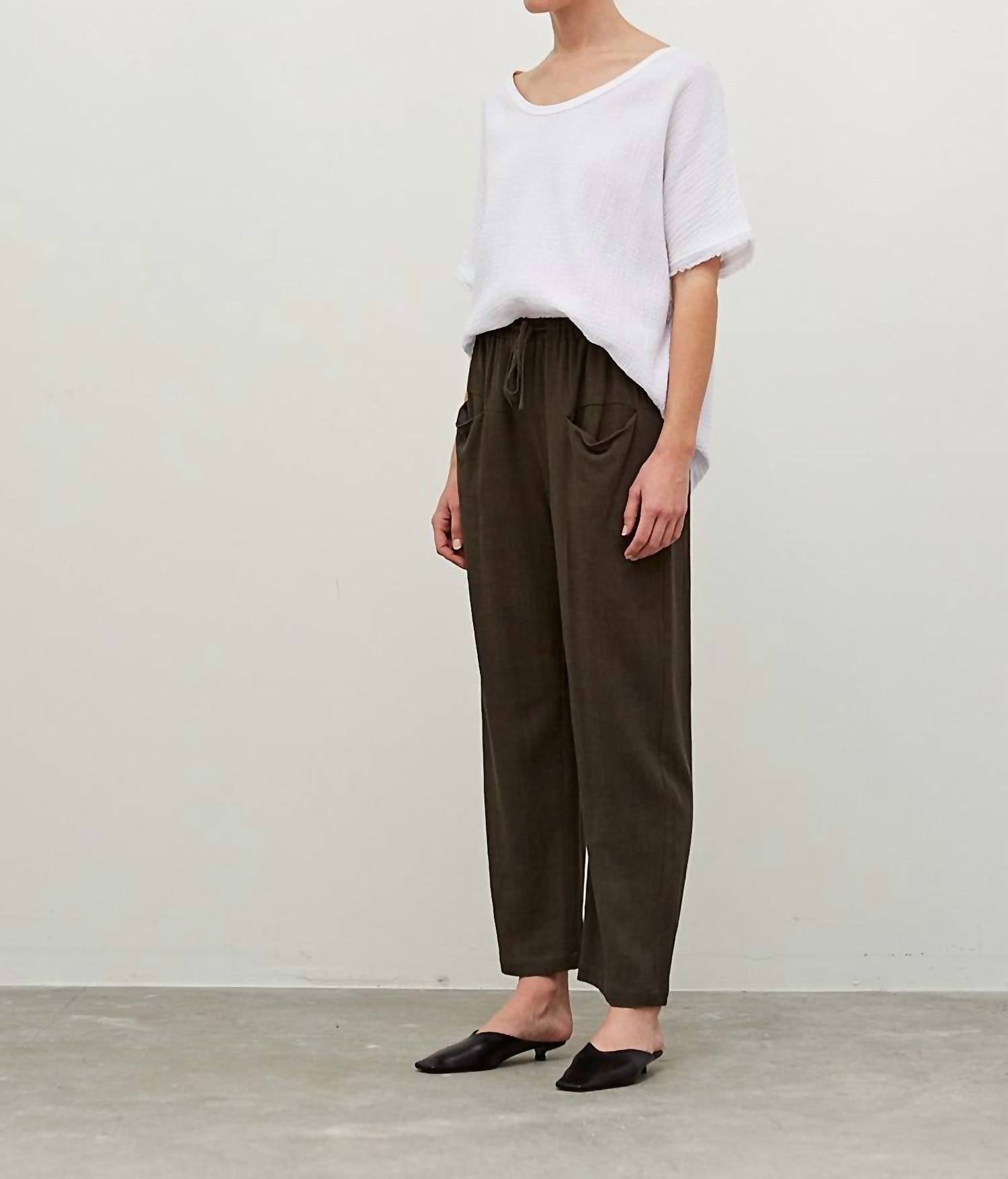 Descubra as Calças de Linho Casual da 124 Voltaire, confeccionadas em uma mistura de linho verde-oliva escuro, macia e sólida, para uso feminino em viagens. Estas calças de caimento relaxado apresentam um prático fecho pull-on com cós elástico e cordão, oferecendo uma silhueta de cintura alta para o máximo conforto. Com uma composição de 70% rayon e 30% linho, estas calças são perfeitas para estilos minimalistas inspirados no outono. Projetadas com praticidade em mente, elas incluem bolsos, tornando-as ideais para o seu estilo de vida em movimento.
