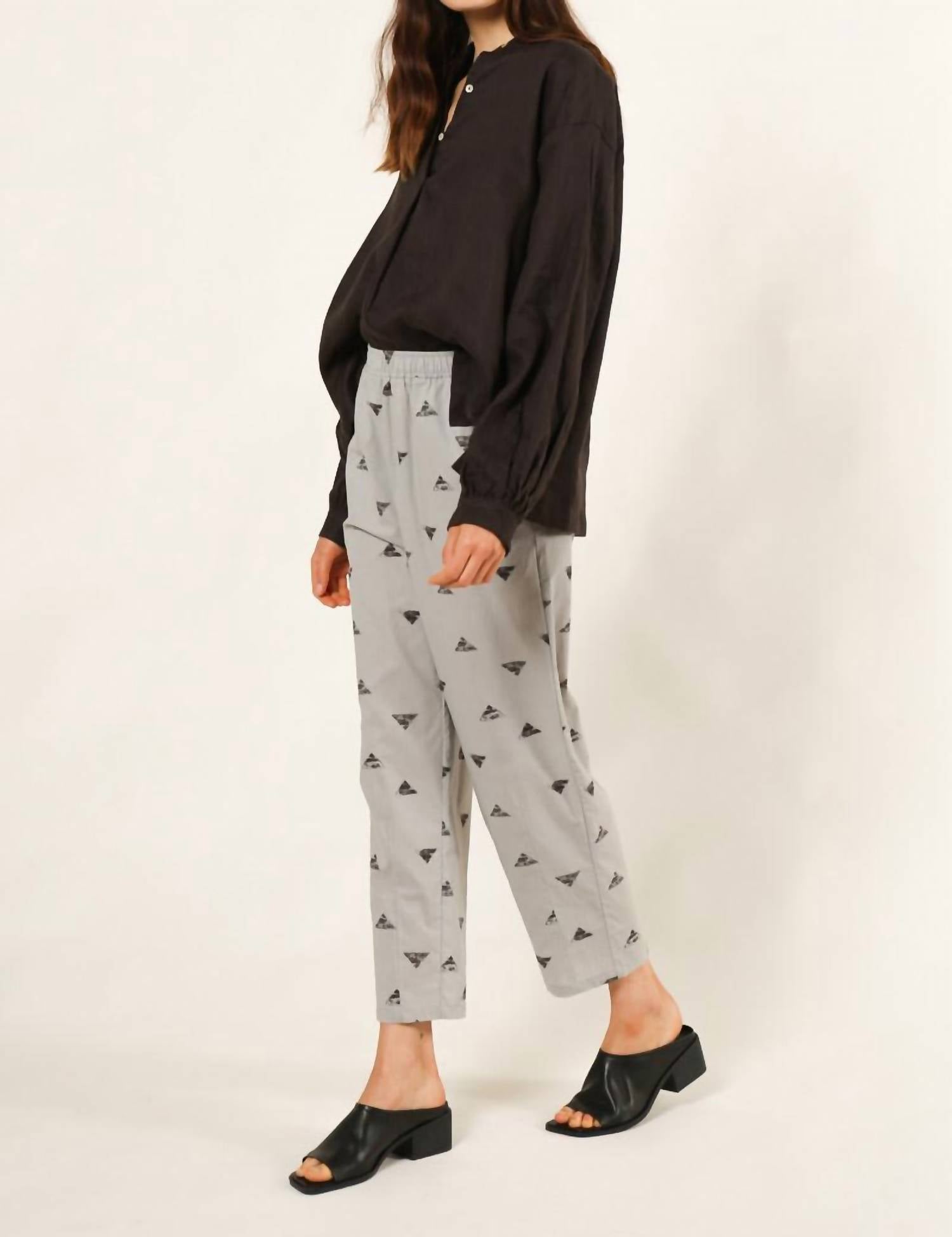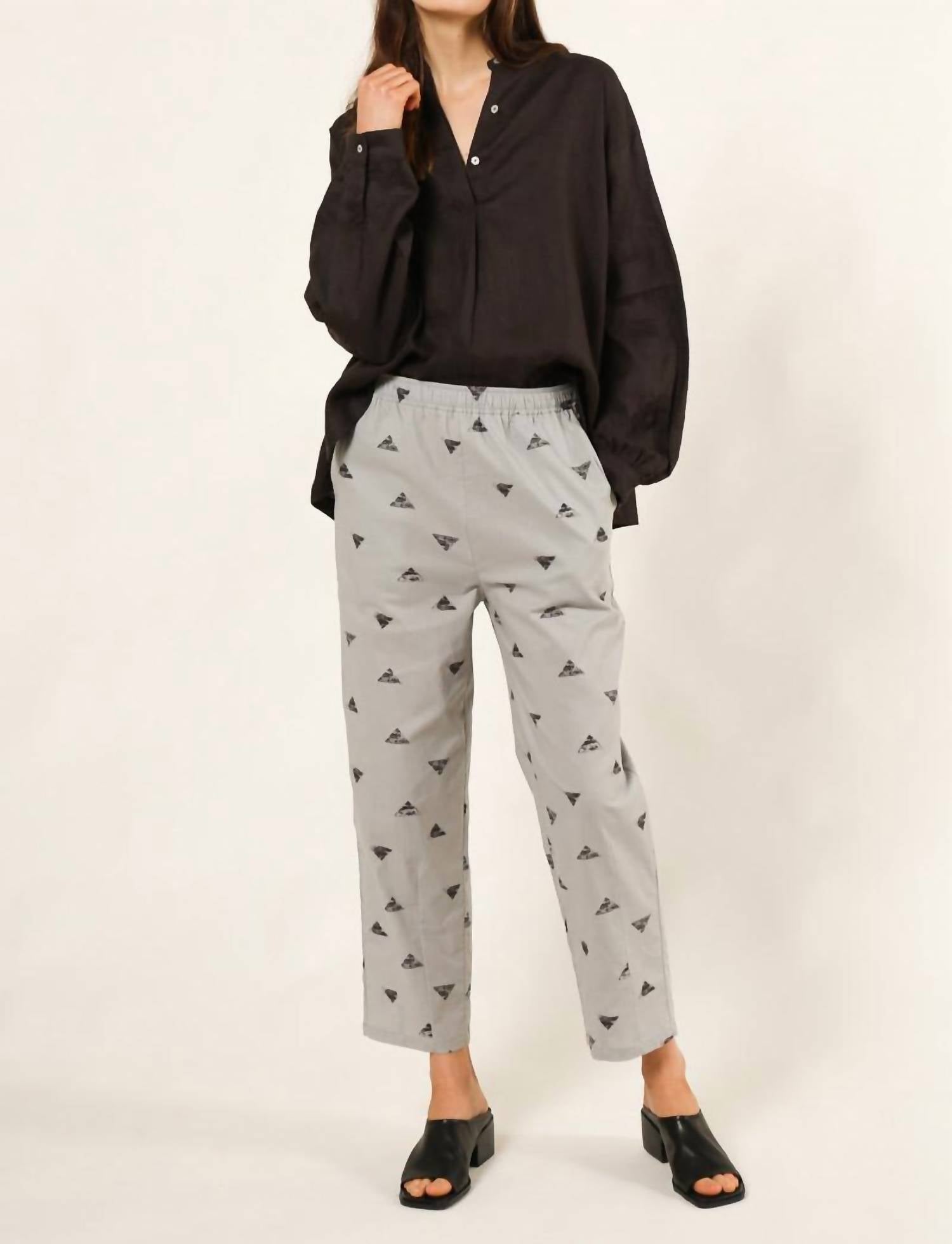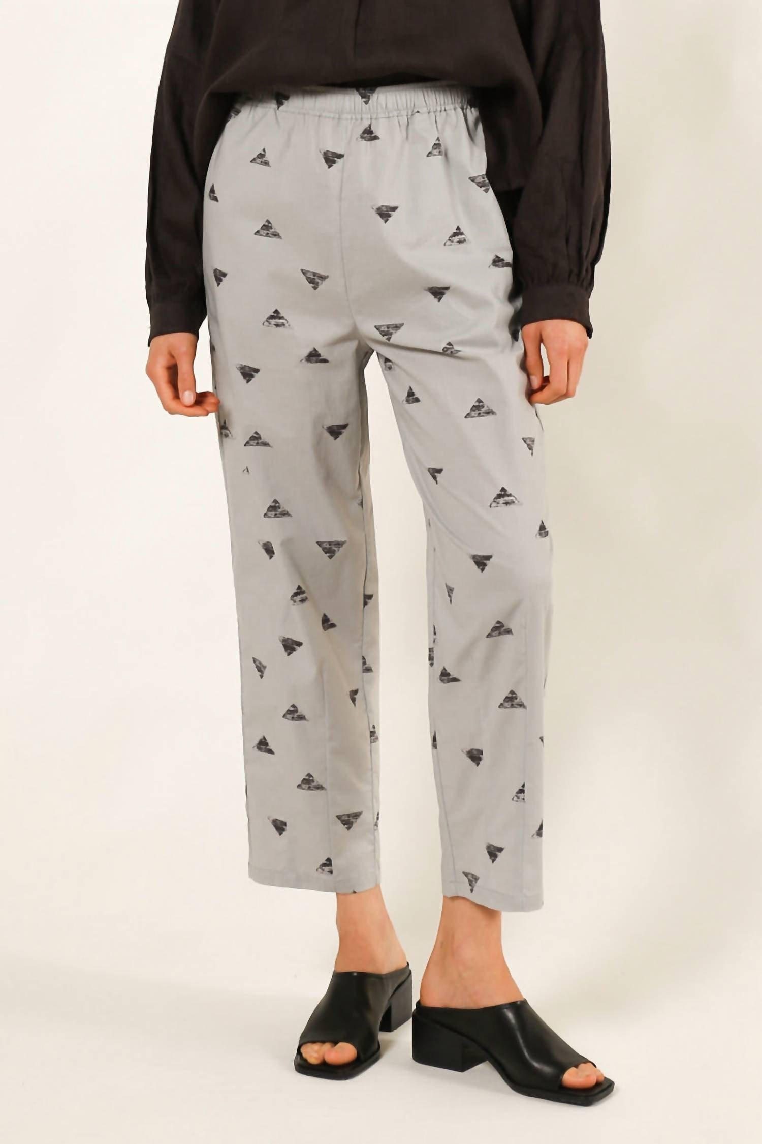 Descubra um estilo despojado com a Calça Tapered com Estampa Triângulo da 124 Voltaire, perfeita tanto para relaxar quanto para aventuras ao ar livre. Esta calça feminina, com uma estampa gráfica chique em cinza e preto, apresenta um corte relaxado com cintura média e corte reto. Fechamento: Puxe para vestir e equipada com bolsos para maior praticidade. Ideal para viagens na primavera, esta calça versátil combina conforto com um toque moderno.
