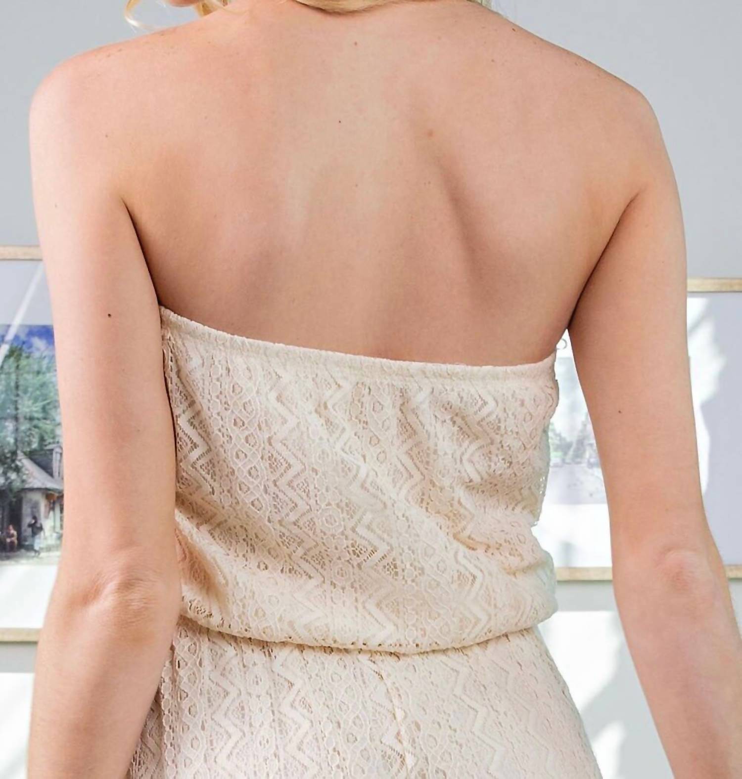 Introducing the Emery Dress by 143 STORY, a stunning strapless piece in a graceful cream hue. Made from a lightweight viscose blend, this dress features an all-over lace pattern with a flattering gathered elastic self-tie waist. The breezy partially lined skirt enhances the overall flowy silhouette. Closure is a tie closure, adding to its elegant look. Hand wash only.