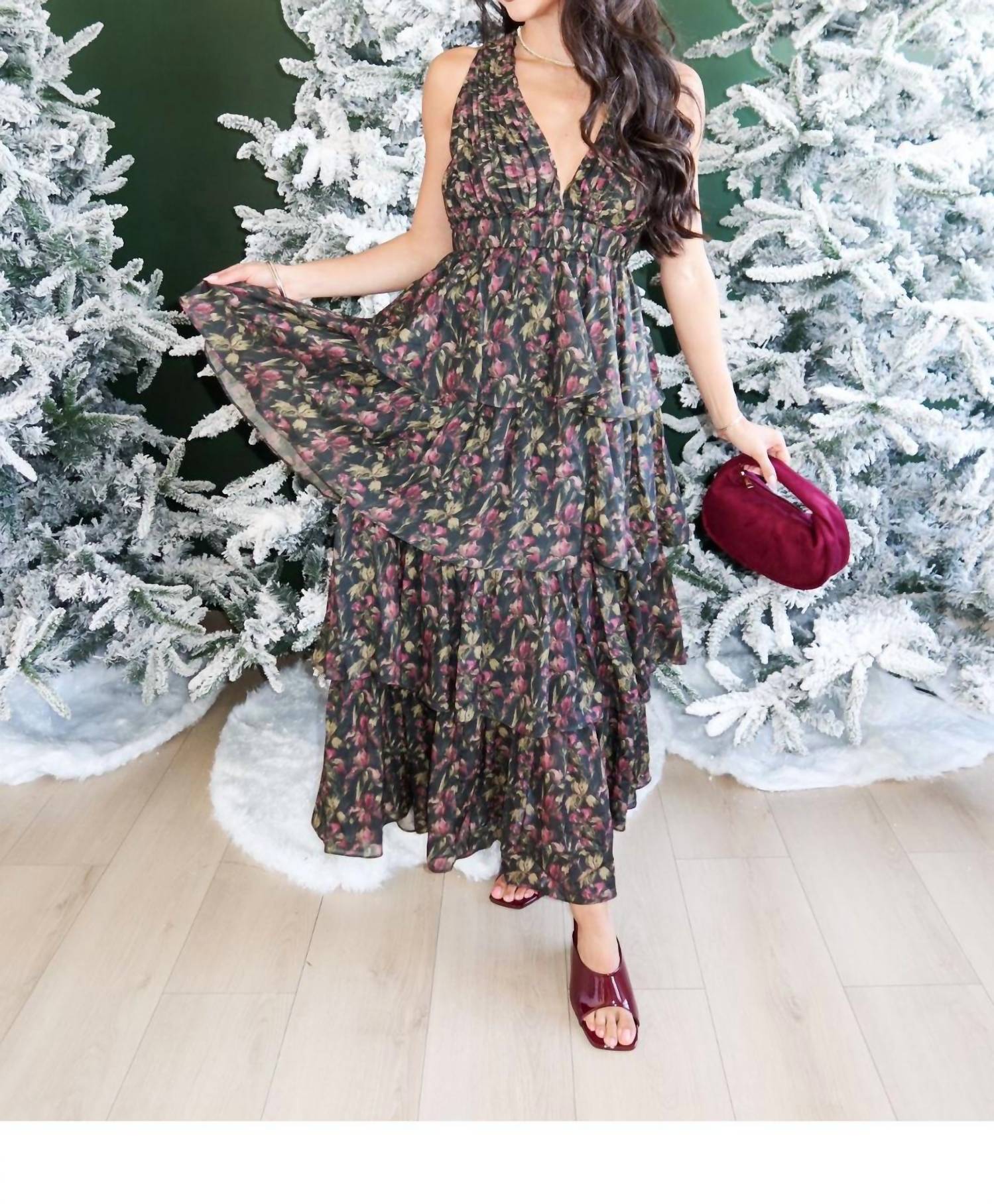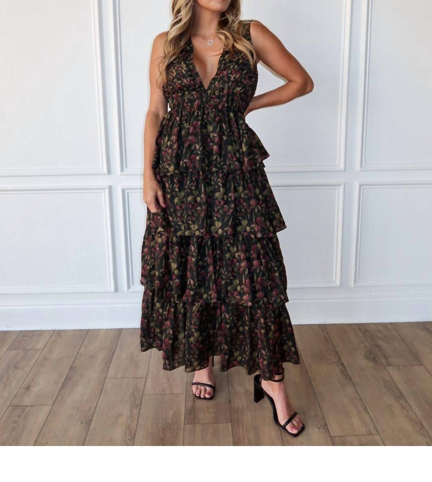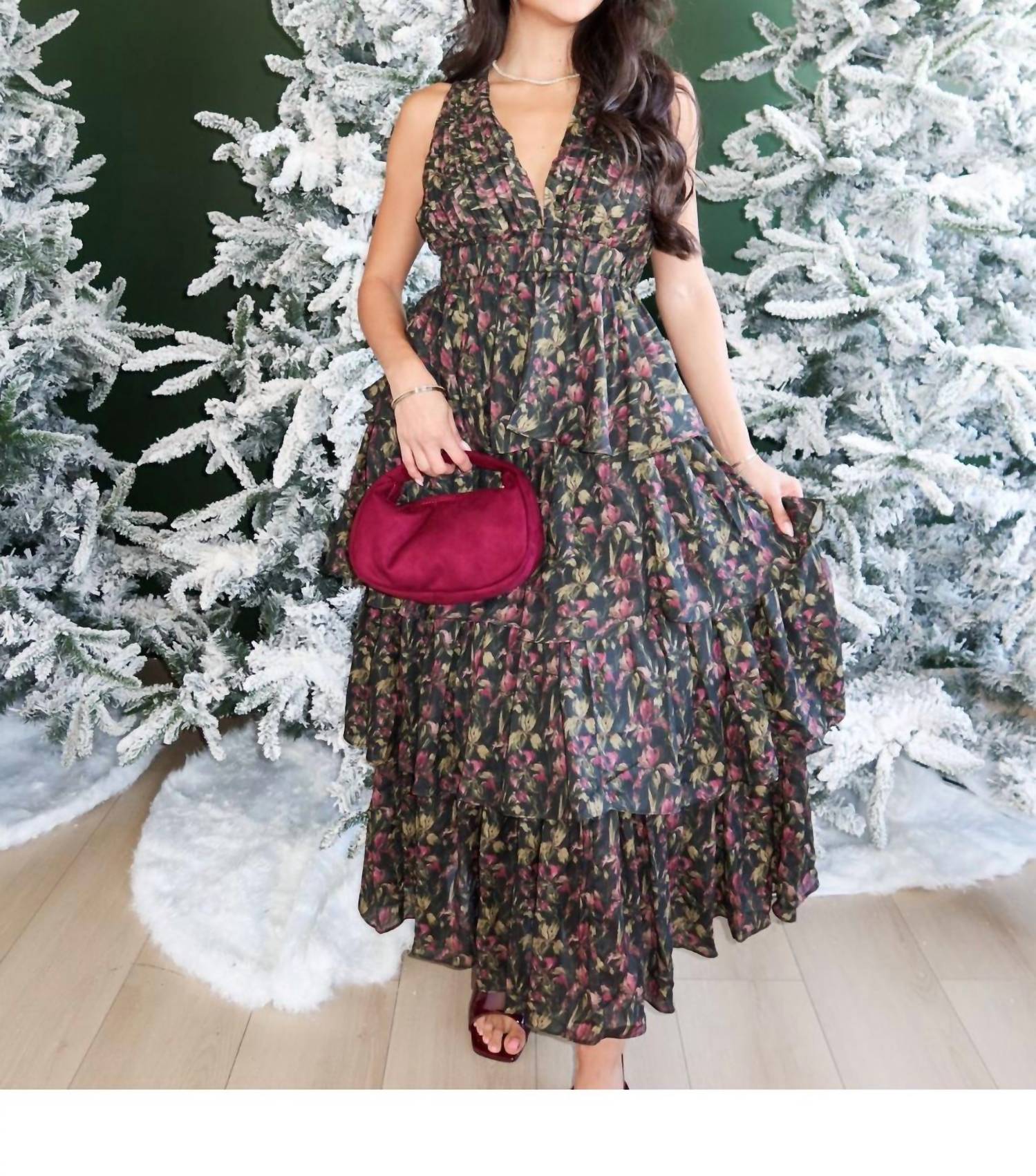 Introducing the Flora & Noir Maxi Dress by 2.7 AUGUST APPAREL, a perfect blend of moody elegance and feminine charm. This sleeveless sheath dress is made from polyester and showcases a striking floral pattern with pink and green blooms on a black base, accentuating the tiered maxi skirt ideal for any summer event. With a flattering V-neckline and fitted bodice, it offers a pull-on closure and is true to size, boasting a structured top with a relaxed, twirl-worthy skirt. Care is simple with hand wash cold and line dry instructions, ensuring your dress remains timeless and beautiful. Model is wearing size XSmall (5'2" height).