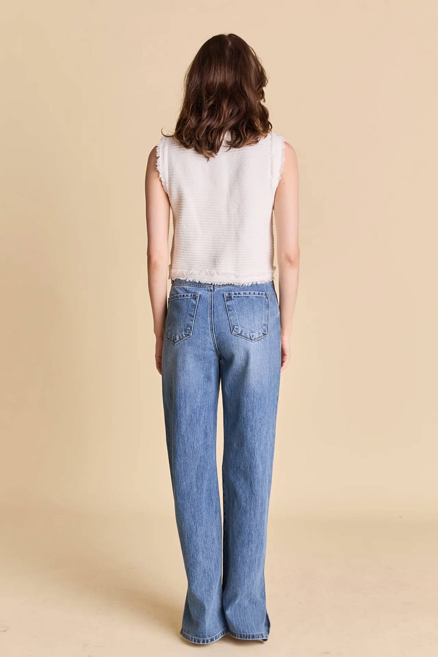 Meet the Julia Fringe Knit Top by 2.7 August Apparel, a staple for your minimalist wardrobe in chic off-white. This sleeveless blouse is crafted from a cotton blend with a textured pattern, embodying a perfect spring feel. Featuring a crewneck design, it adds a touch of elegance with its button closure and functional pockets. Composition: 62% Cotton, 38% Nylon. Care instructions: Machine wash.