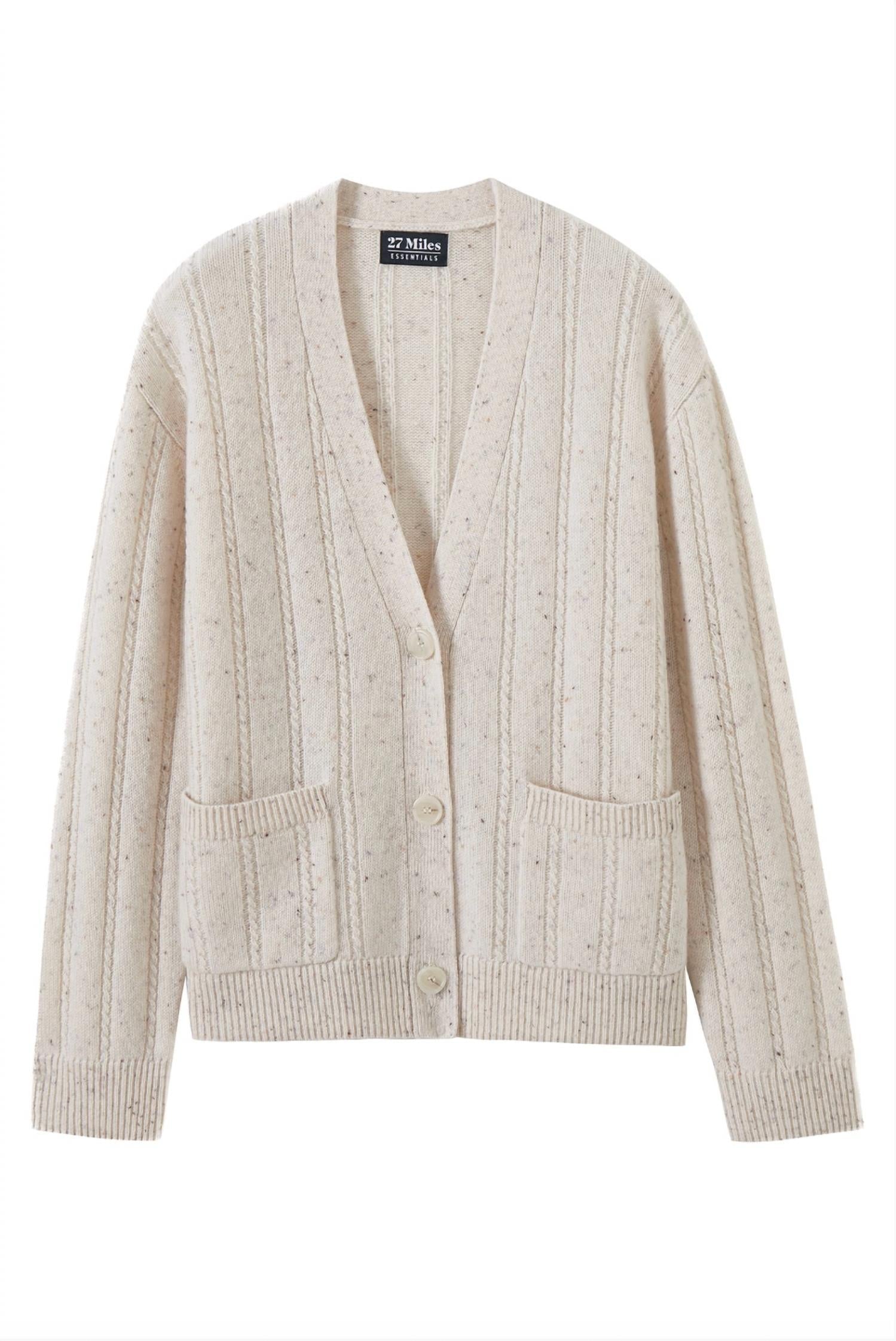 This cardigan will be a sweater-rotation favorite. Elevate your holiday wardrobe with the Women's Francis Cardigan by 27 Miles Malibu, offered in a sophisticated Coconut hue. This cardigan, ideal for a Thanksgiving gathering or holiday party, is crafted from 100% cashmere, promising luxurious comfort and a textured pattern for a minimalist fall aesthetic. It features long sleeves, a V-neckline, and convenient pockets, all secured with a button closure. Made without specific care instructions provided, it's recommended to handle this exquisite piece with standard cashmere care practices.