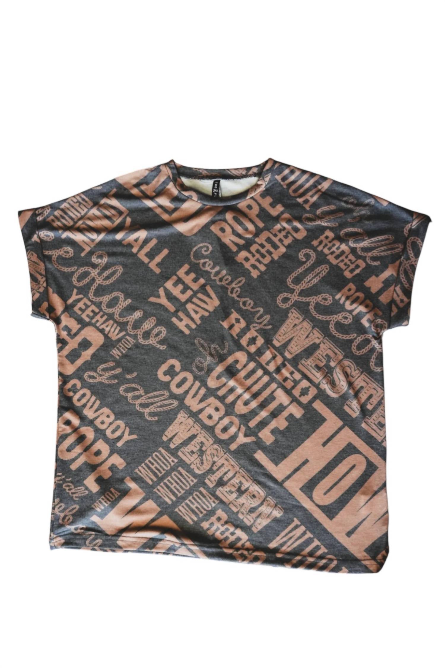 Apresentamos a camiseta Western Lingo da 2FlyCo, uma adição elegante a qualquer guarda-roupa com seu tom Saddle e design gráfico. Esta camiseta feminina tem mangas curtas e gola redonda confortável, confeccionada em uma mistura de algodão (60% algodão e 40% elastano) para um caimento perfeito. Seu comprimento mais longo permite um estilo versátil, principalmente com leggings. Projetada com fecho pull-on, não possui instruções específicas de lavagem ou secagem, oferecendo flexibilidade nos cuidados com a peça.