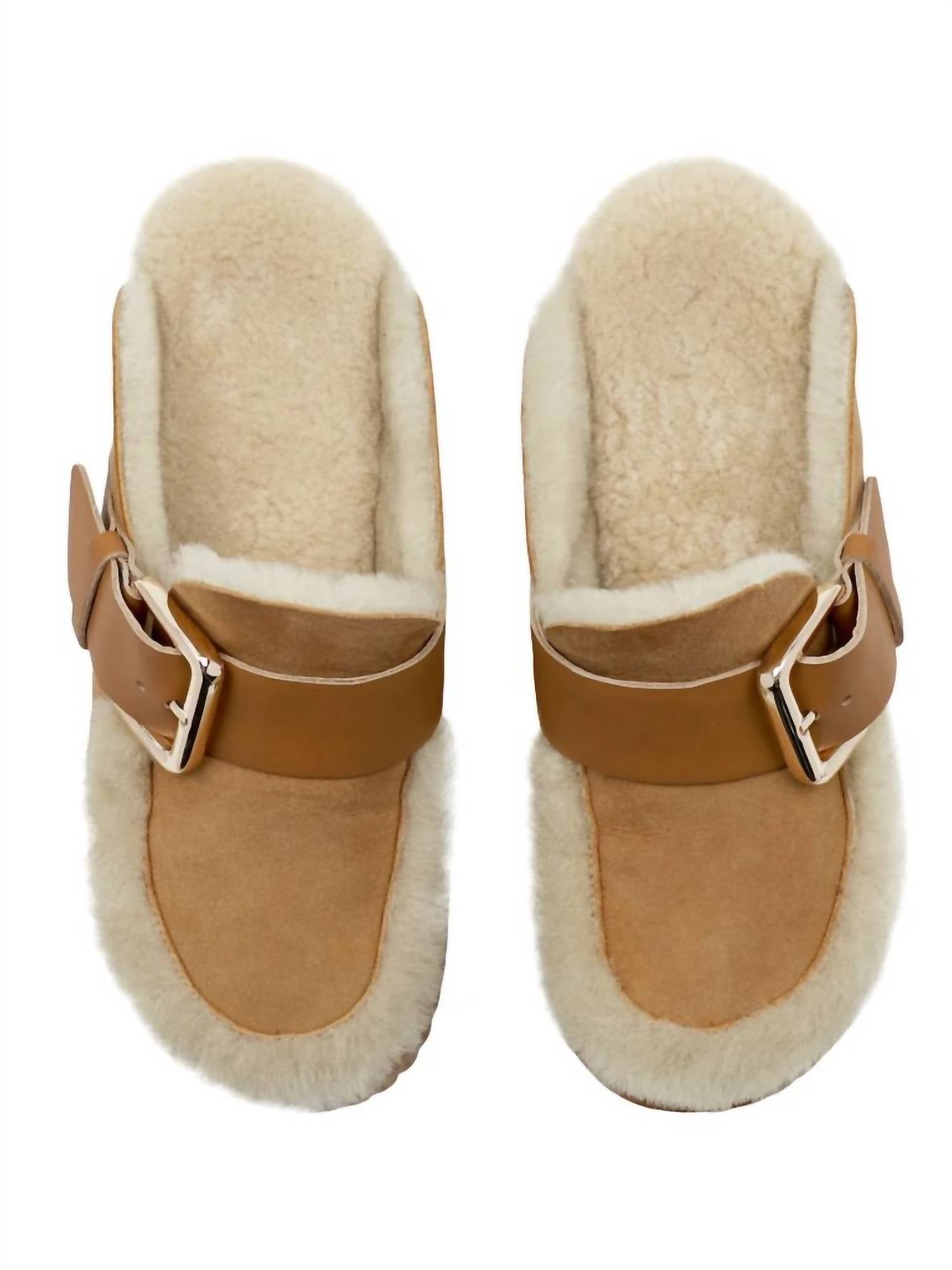 Step into style with the 4CCCCEES Women's Pila Amber Clogs, a perfect blend of minimalism and functionality. Crafted from camel brown sheep leather and sheep shearling, these clogs boast a chunky heel and round toe design for a chic vacation-ready look. The platform soles are carved from foam rubber and elevate the height to a comfortable 70mm. Detailed with a metal buckle for an ideal fit, these clogs embody a balance of modern materials and traditional inspiration.