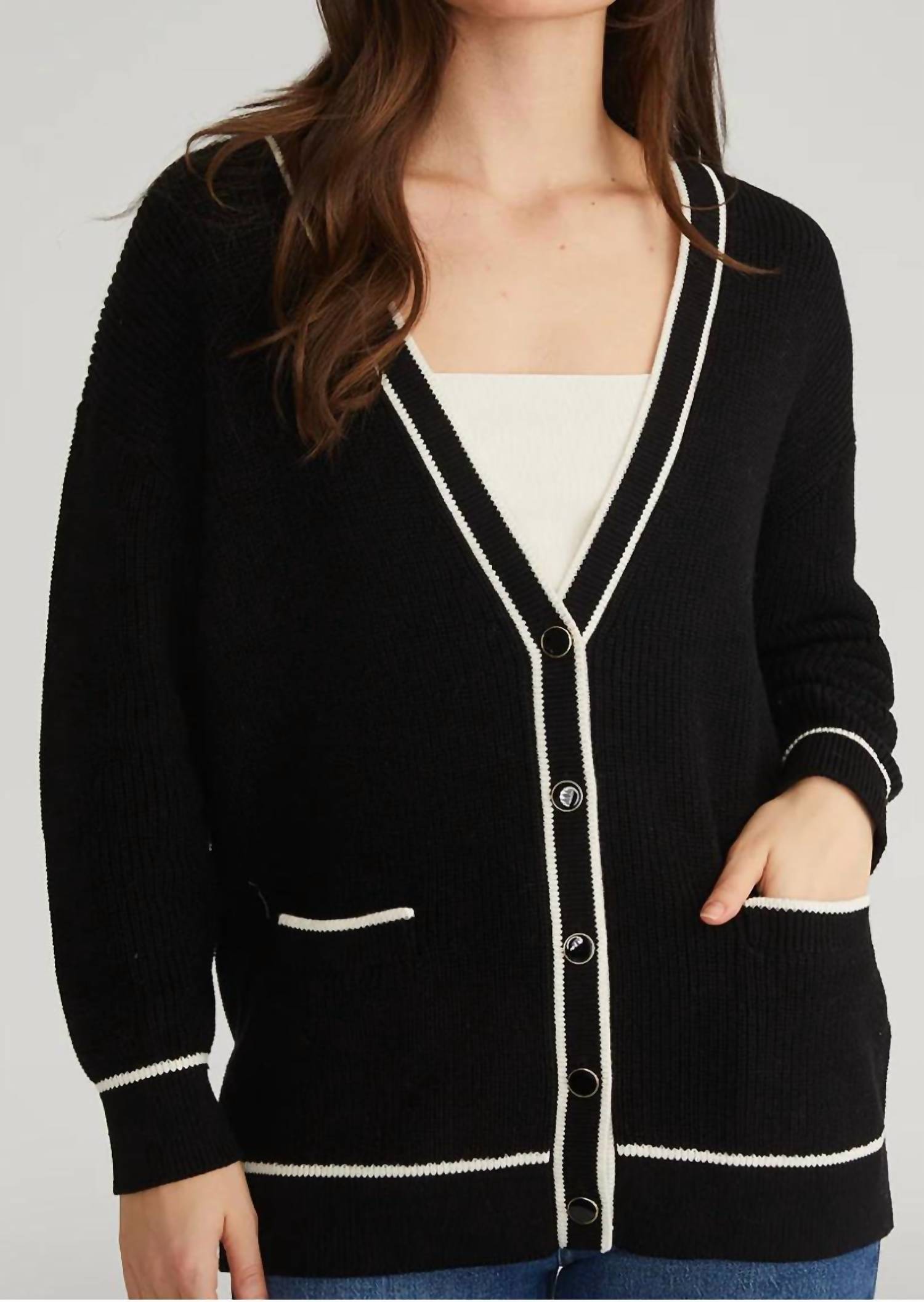 Throw this adorable cardigan over any cami or tank top. The Emma Oversized Cardigan by 525 America brings a chic twist to the classic grandpa style with a modern oversized fit. Crafted from 100% cotton, this long sleeve cardigan in versatile black features convenient front pockets and elegant contrast tipping. Measuring 27" in length, it boasts a relaxed v-neck design and a button closure for easy wearing. Care is simple: machine wash and tumble dry low.