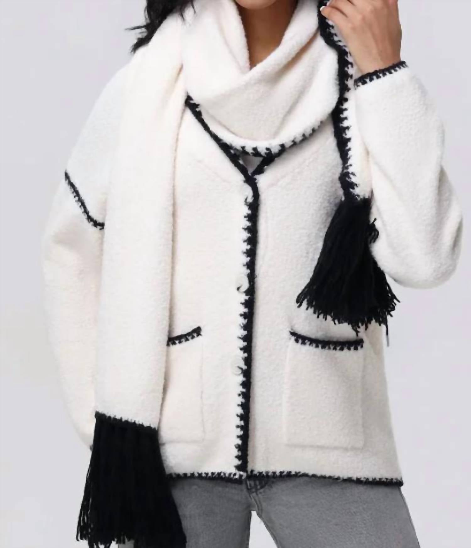 The whipstitch detailing throughout and drop shoulder design add a touch of casual sophistication, making this cardigan a chic addition to your wardrobe. Includes the scarf as well.