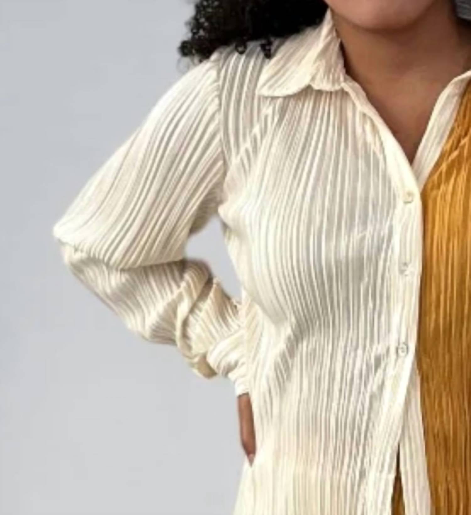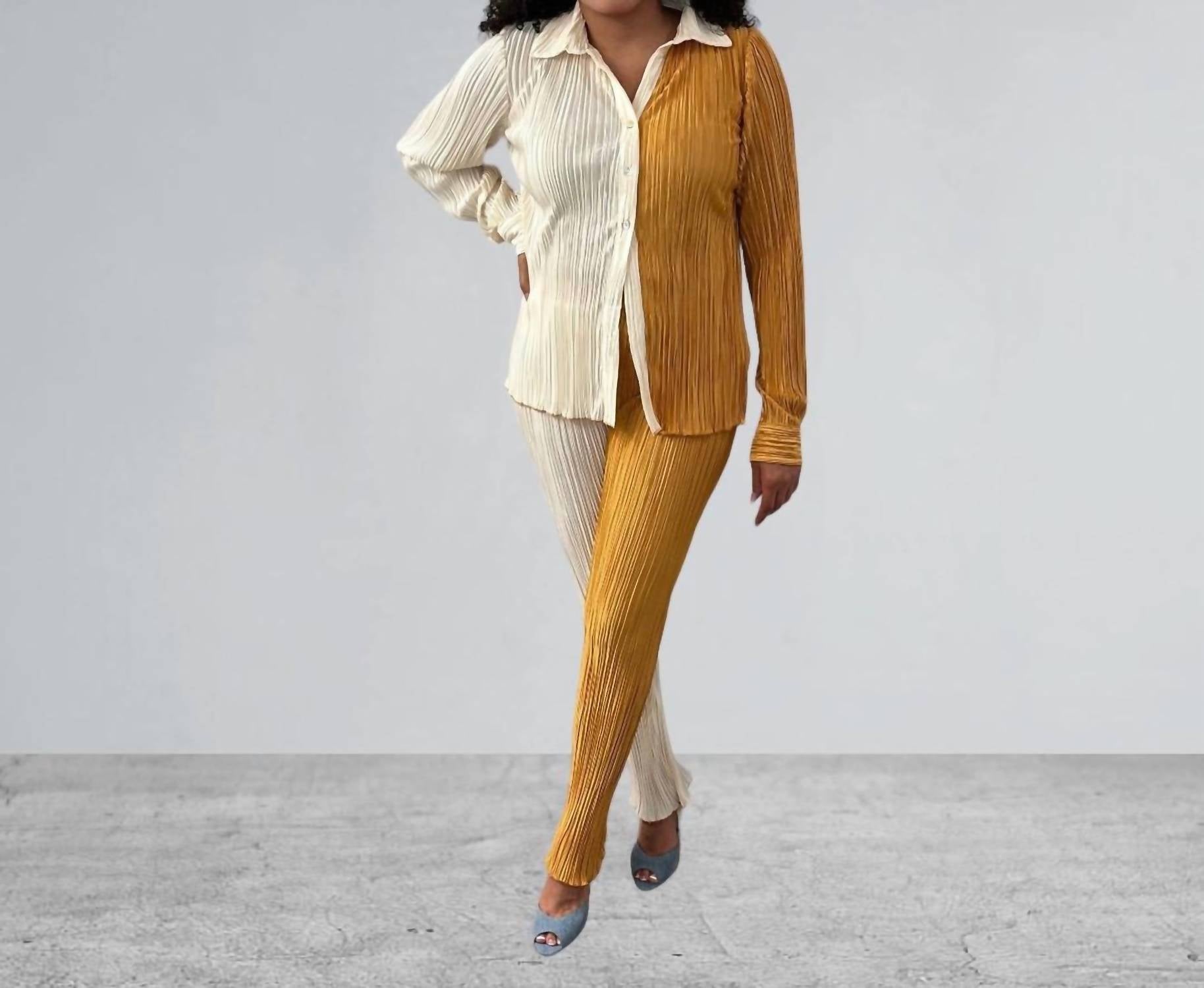 Um conjunto tão fofo que você nunca mais vai querer tirar. Desenvolvido para ser um charme no momento de relaxar, este pequeno item é perfeito para ficar em casa com estilo. O Conjunto Caprice Color Block da 5Besties é um conjunto loungewear chique em off-white e mostarda, perfeito para qualquer ocasião. O conjunto apresenta um top franzido com fecho de botão e mangas compridas, combinado com calças de cintura alta e pernas largas com 84 cm de comprimento para uma silhueta marcante. Feito em 100% poliéster, este conjunto oferece fácil manutenção e conforto com cós elástico. Ideal para festas de fim de ano, seu design em blocos de cores traz um toque de interesse visual, tornando-o uma escolha de destaque para a elegância do verão.