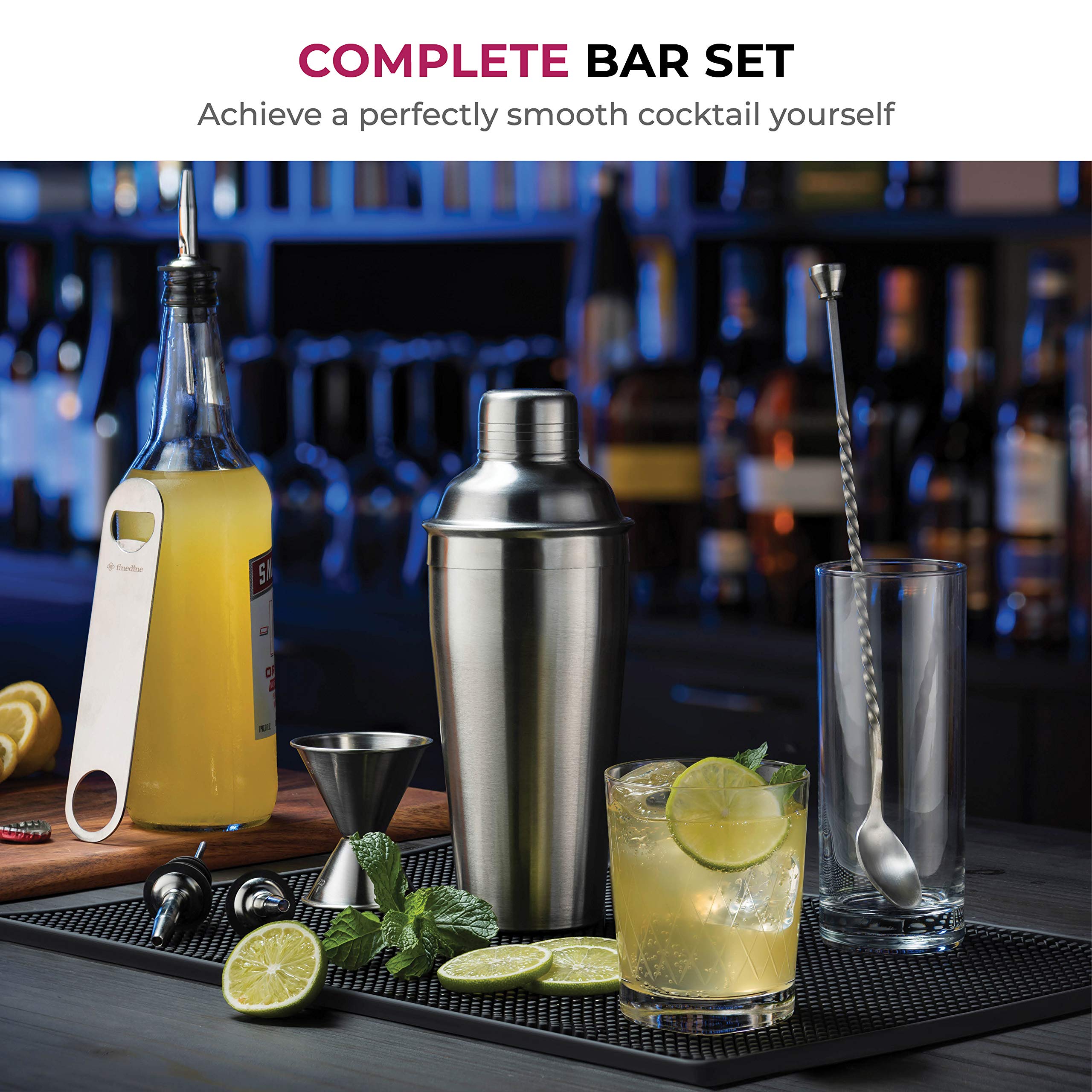 - CONJUNTO DE BAR COMPLETO - Consiga um coquetel perfeitamente suave com ingredientes totalmente integrados. O conjunto inclui uma coqueteleira de 813 ml e 553 ml com tampa e filtro que retém pedaços e gelo, um dosador duplo de 30 ml e 60 ml, um macerador, um abridor de cerveja e refrigerante, 6 dosadores de garrafas e um coador de coquetel Hawthorne.
