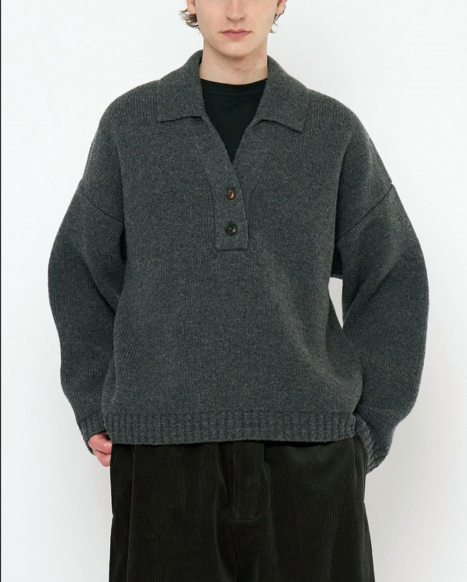 Discover the Chunky Collared Recycled Wool Pullover by 7115 by SZEKI, a beautifully minimalist piece in elegant gray. With long sleeves and crafted from sustainable wool, this pullover effortlessly marries warmth with style. While its structured collar adds a sophisticated touch, the convenient button closure ensures ease of wear. Perfect for your fall wardrobe, this solid pattern piece is designed for those who value timeless elegance and eco-conscious fashion.