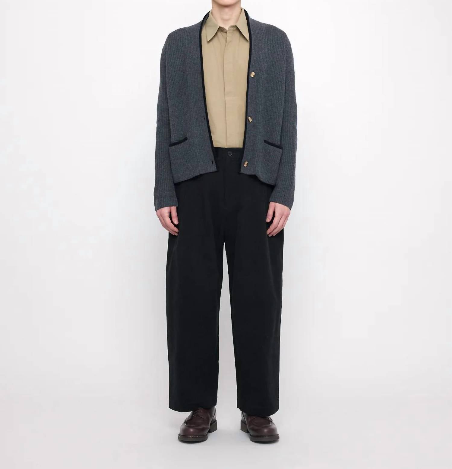 The V-neck Pockets Trimmed Cardigan by 7115 by SZEKI is an essential layering piece designed for versatility. Made in China, this grey cardigan features long sleeves and a textured wool blend composition of 55% superfine merino, 20% organic cotton, and 25% recycled nylon. With a relaxed fit and convenient set-in pockets, it boasts a button closure and a garment length of 25 inches. Ideal for fall travels, this cardigan should be gently washed and laid flat to dry. Model Junho, 6'0", is wearing a medium.