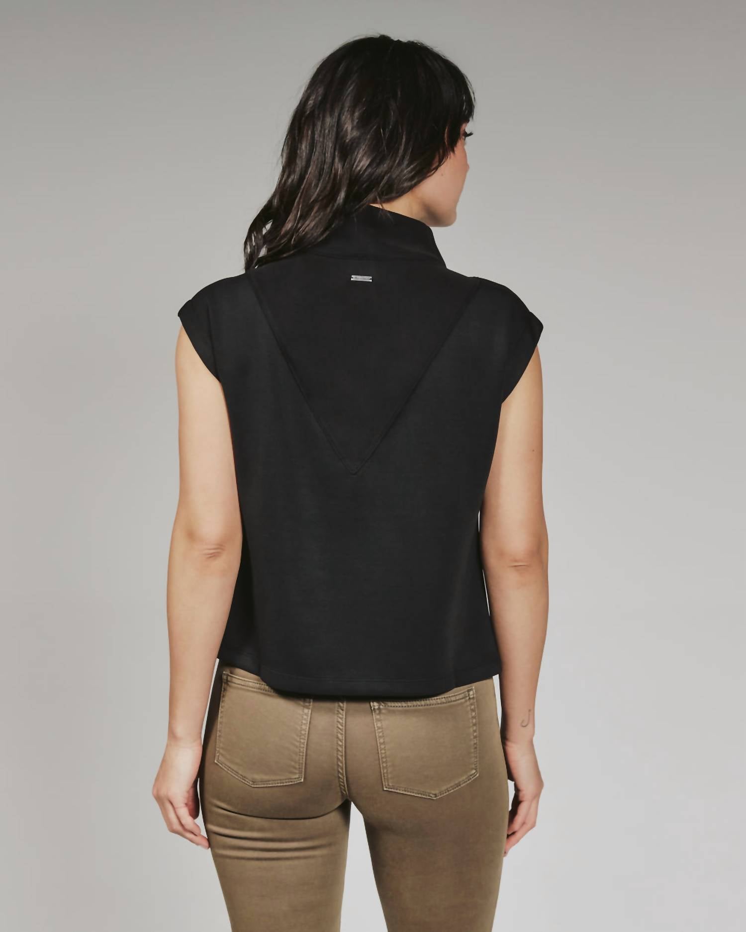 A timeless blouse that will never go out of style. Discover the Rev Sleeveless Half Zip Pullover by 7Diamonds, crafted in solid onyx for a sophisticated touch of urban inspiration. This versatile mockneck pullover features a quarter-zip closure and is designed with cap sleeves, perfect for any occasion from casual outings to anniversary celebrations. Composition boasts 49% Polyester, 41% Modal, and 10% Spandex, promising both comfort and movement flexibility. Care instructions suggest turning inside out and machine washing cold on a delicate cycle; avoid bleach, tumble drying, or direct sunlight to ensure lasting elegance.