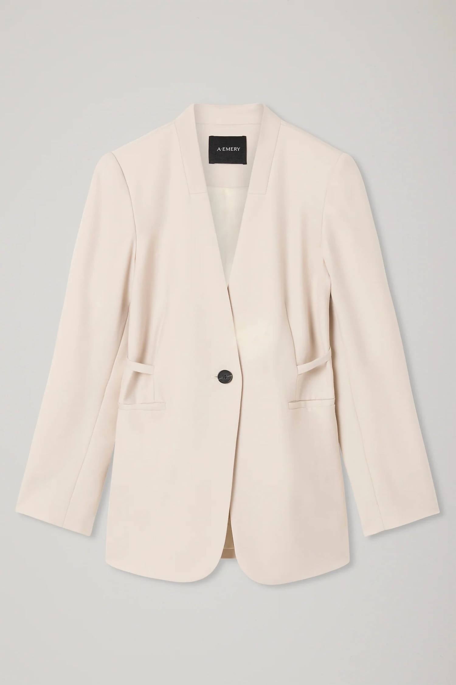 Tailored to perfection, this blazer will be your go-to jacket for years to come. Introducing the Clifton Long Sleeve Blazer by A.Emery, a sophisticated addition to your fall wardrobe. Crafted from 100% wool with a lining of 52% polyester and 42% viscose, this blazer offers a luxurious feel and true-to-size fit in an elegant oyster shade. Designed with a classic collar and solid pattern, the piece features a button closure for a polished look, perfect for travel or a preppy ensemble. Care for it with professional dry cleaning to maintain its pristine condition.