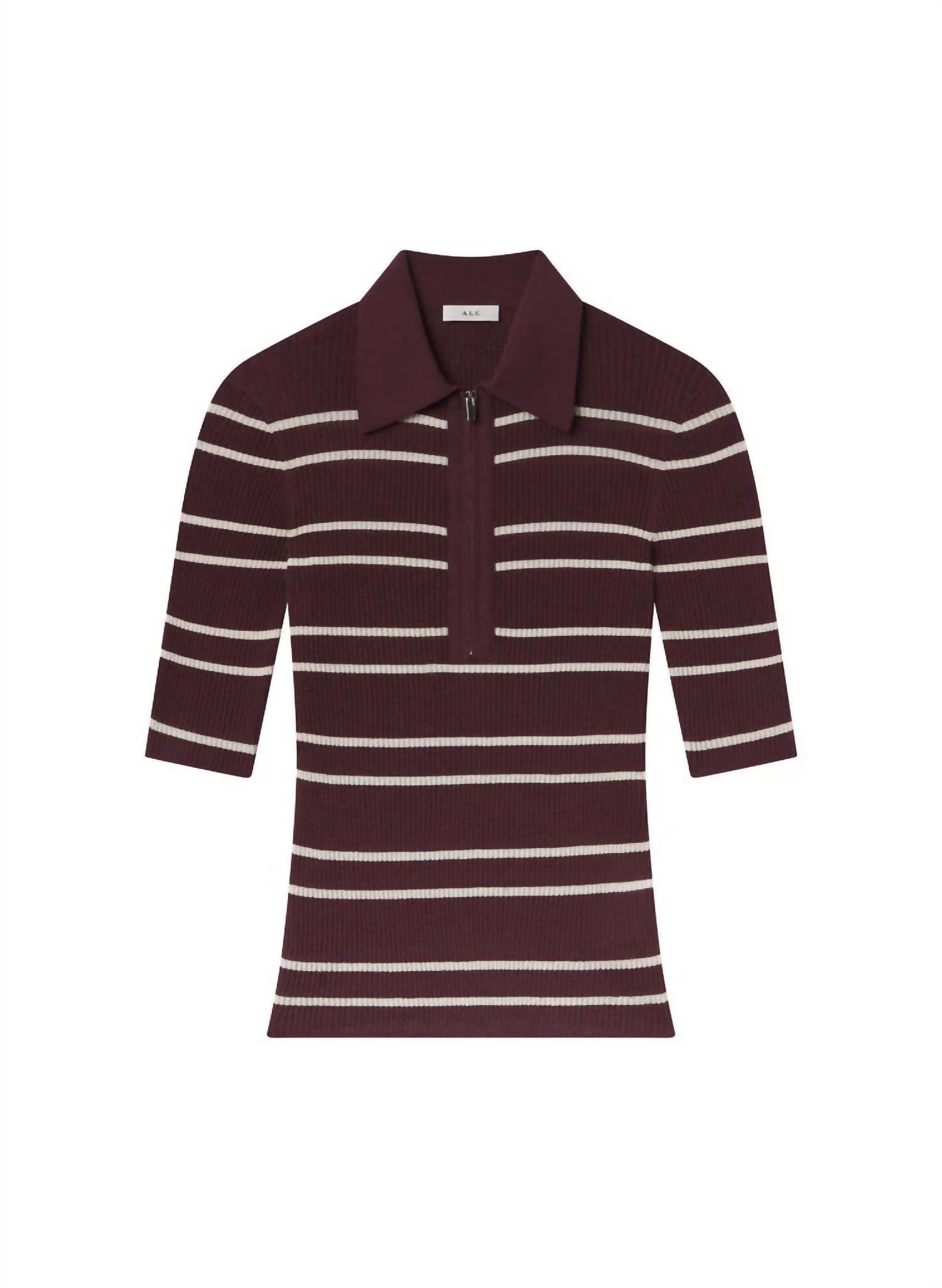 Pair this with your favorite jeans and slides for your next girls night out. Discover the Cooper Fine Cotton Ribbed Top by A.L.C., a chic addition to any holiday party wardrobe in Carob Wide Stripe. This women's blouse features short sleeves and a minimalist stripe pattern, crafted from a comfortable cotton blend consisting of 78% cotton and 22% nylon. Designed with a collar neckline, it offers an elegant zip closure. Perfect for spring occasions, this piece embodies a timeless minimalist aesthetic.