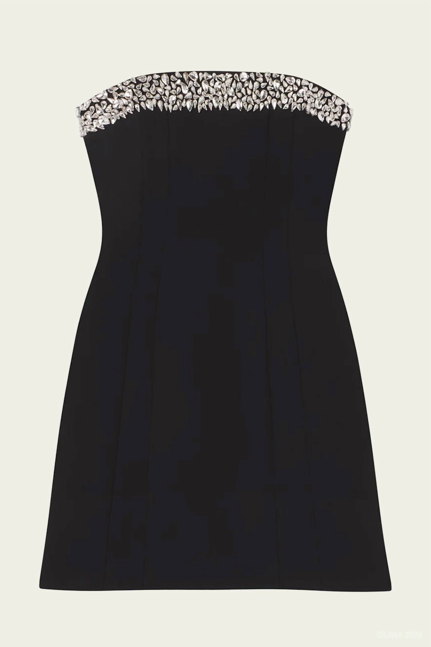 Introducing the Elsie Strapless Embellished Mini Dress by A.L.C., a stunning choice for your New Year's Eve celebrations. This dress features a strapless design with an off-the-shoulder neckline, crafted from a blend of 70% Triacetate and 30% Polyester. Its mini length offers a chic silhouette, made with quality in mind as it is imported. This solid black piece requires dry cleaning to maintain its sleek appearance.