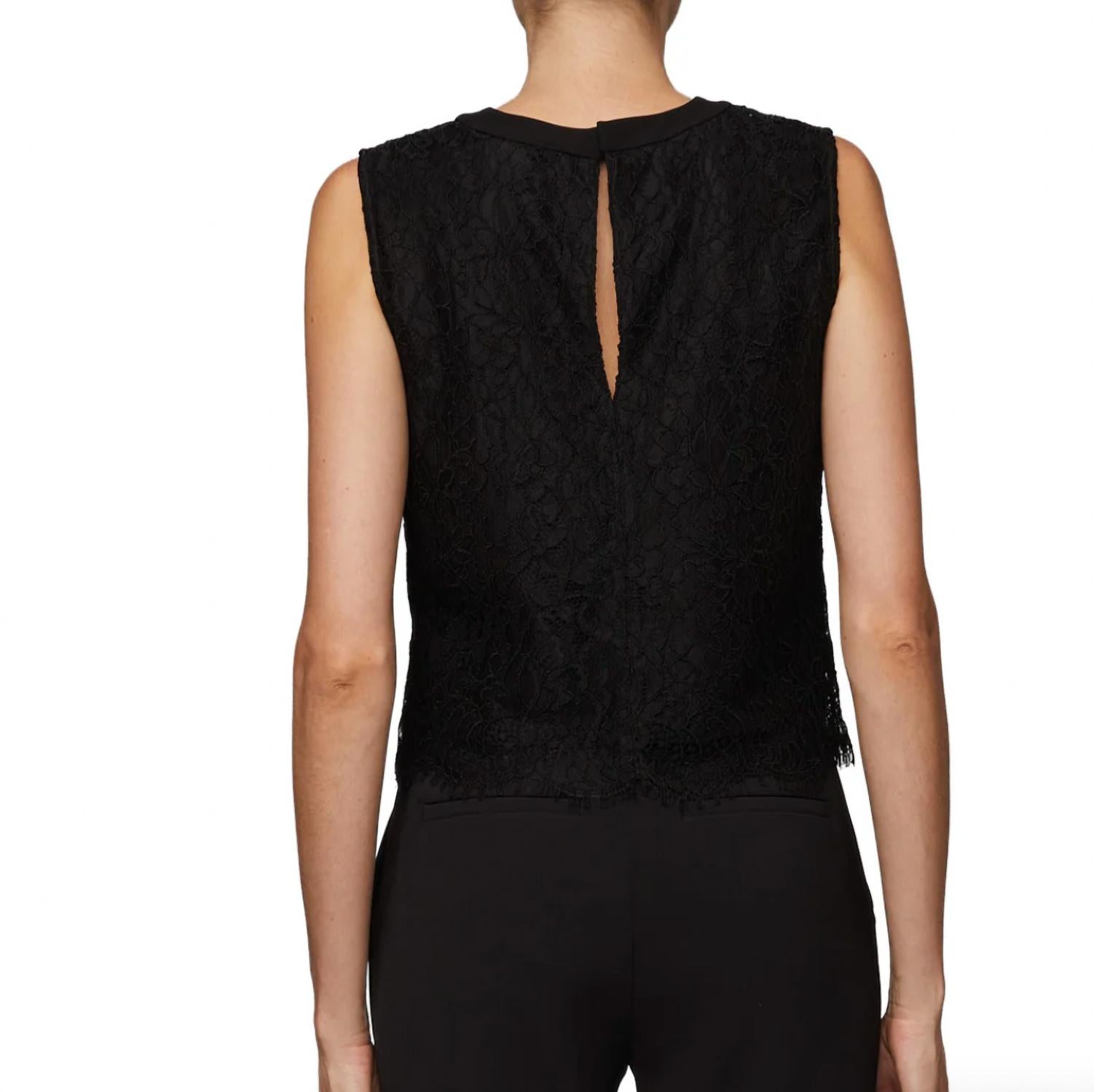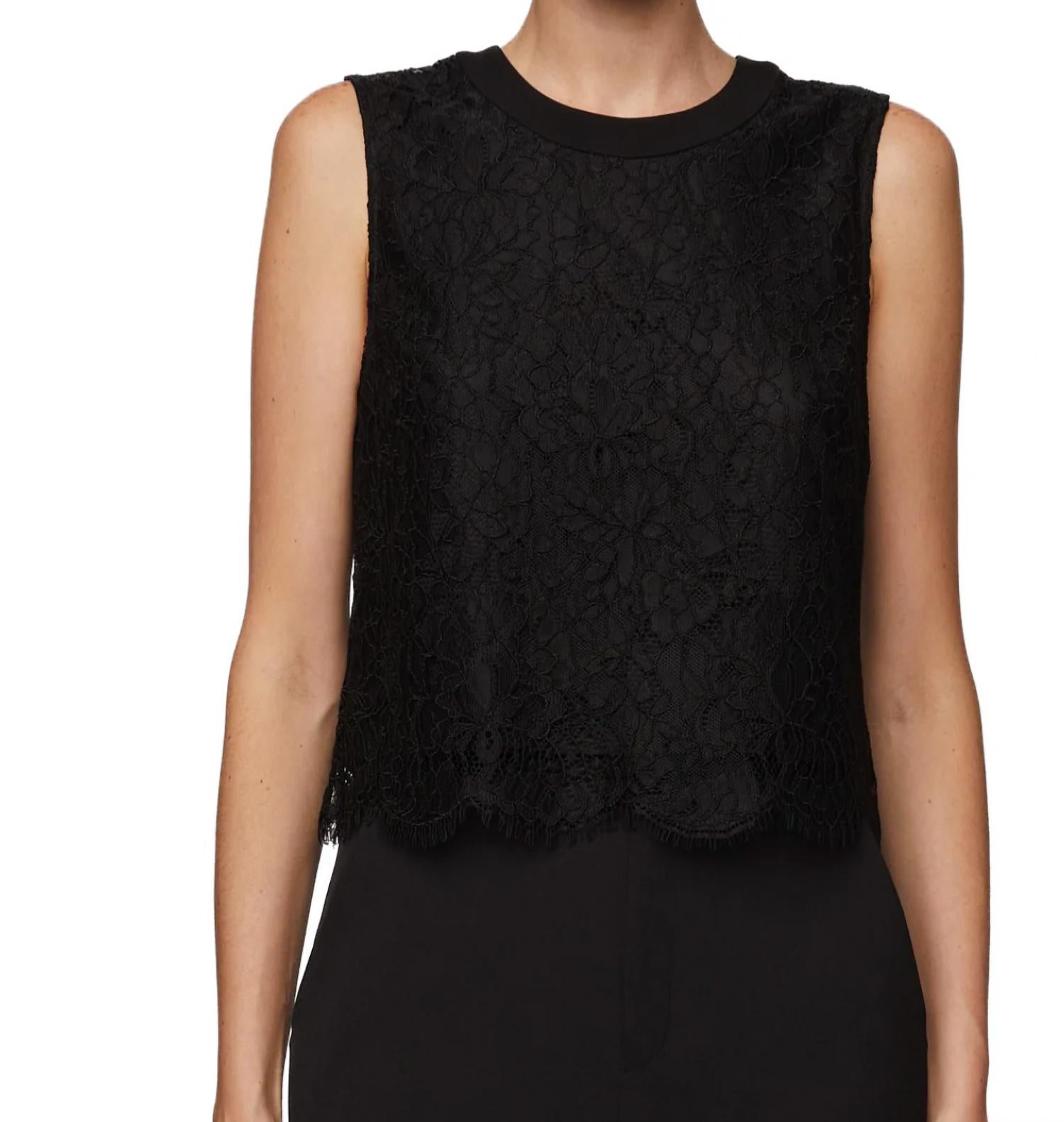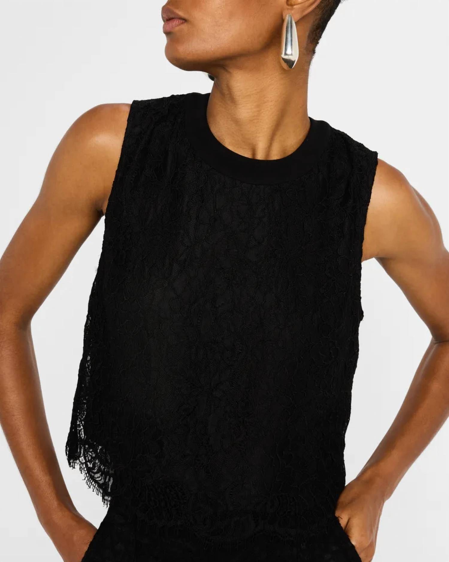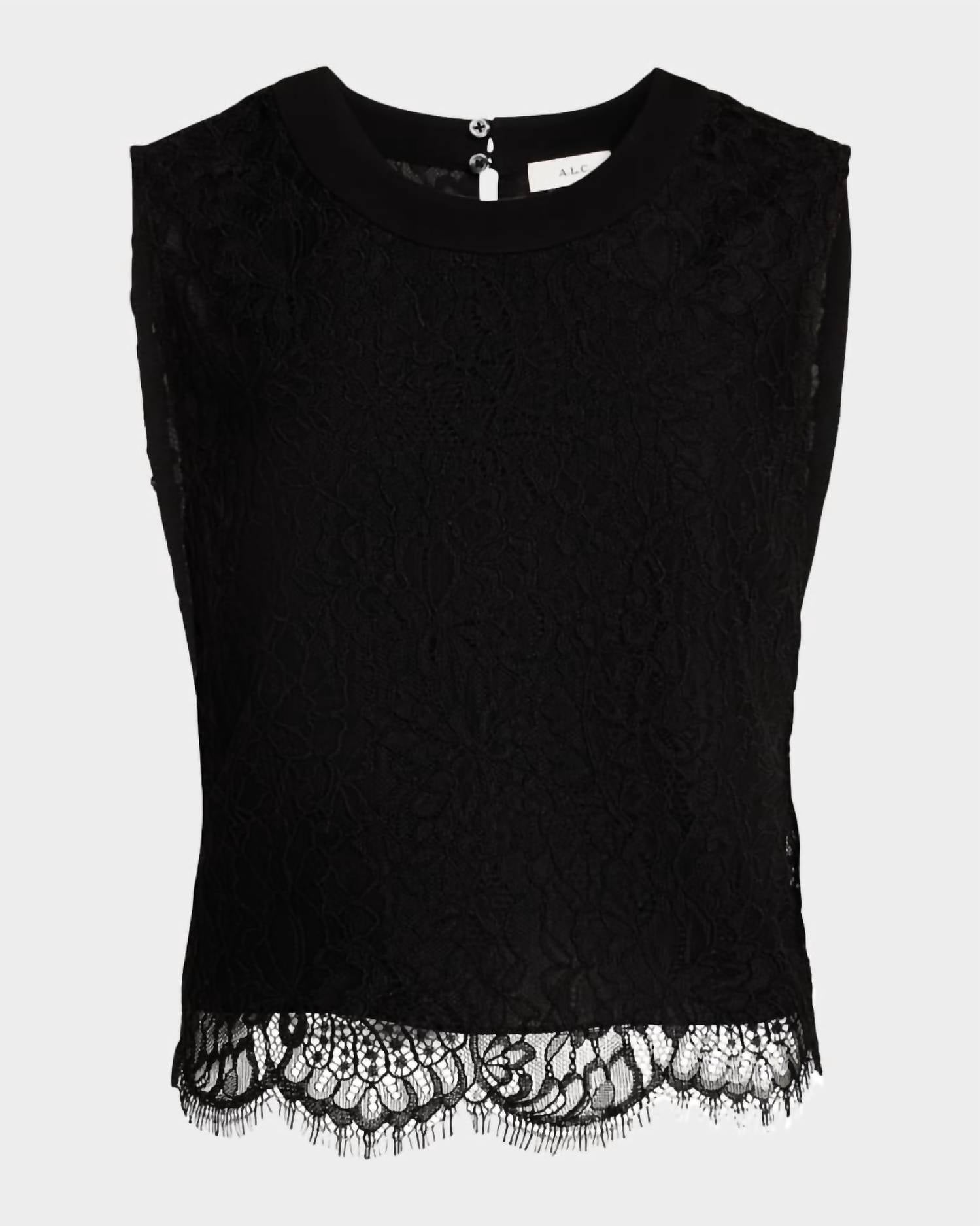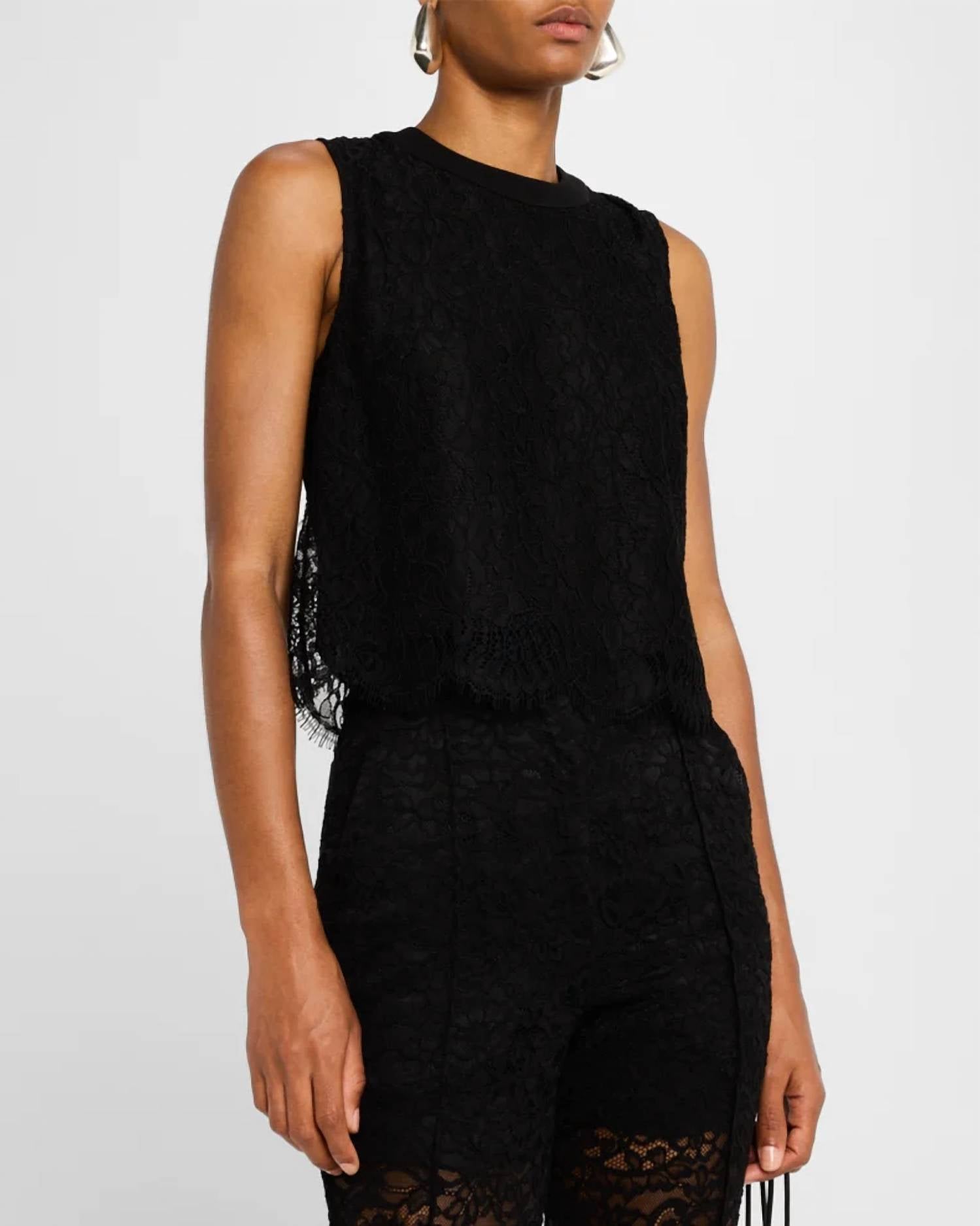 Caimento, tecido e funcionalidade. Esta regata preenche todos os requisitos. Apresentamos o Gai Top da ALC, um top preto de renda marcante com uma silhueta cropped cativante. Esta peça sem mangas e ultrafeminina apresenta um delicado acabamento em cílios e um fecho de botão tipo fechadura nas costas, tornando-se uma adição elegante a qualquer guarda-roupa. Com sua estampa sólida e gola redonda, combina perfeitamente com saias, calças ou jeans de cintura alta para um look versátil.