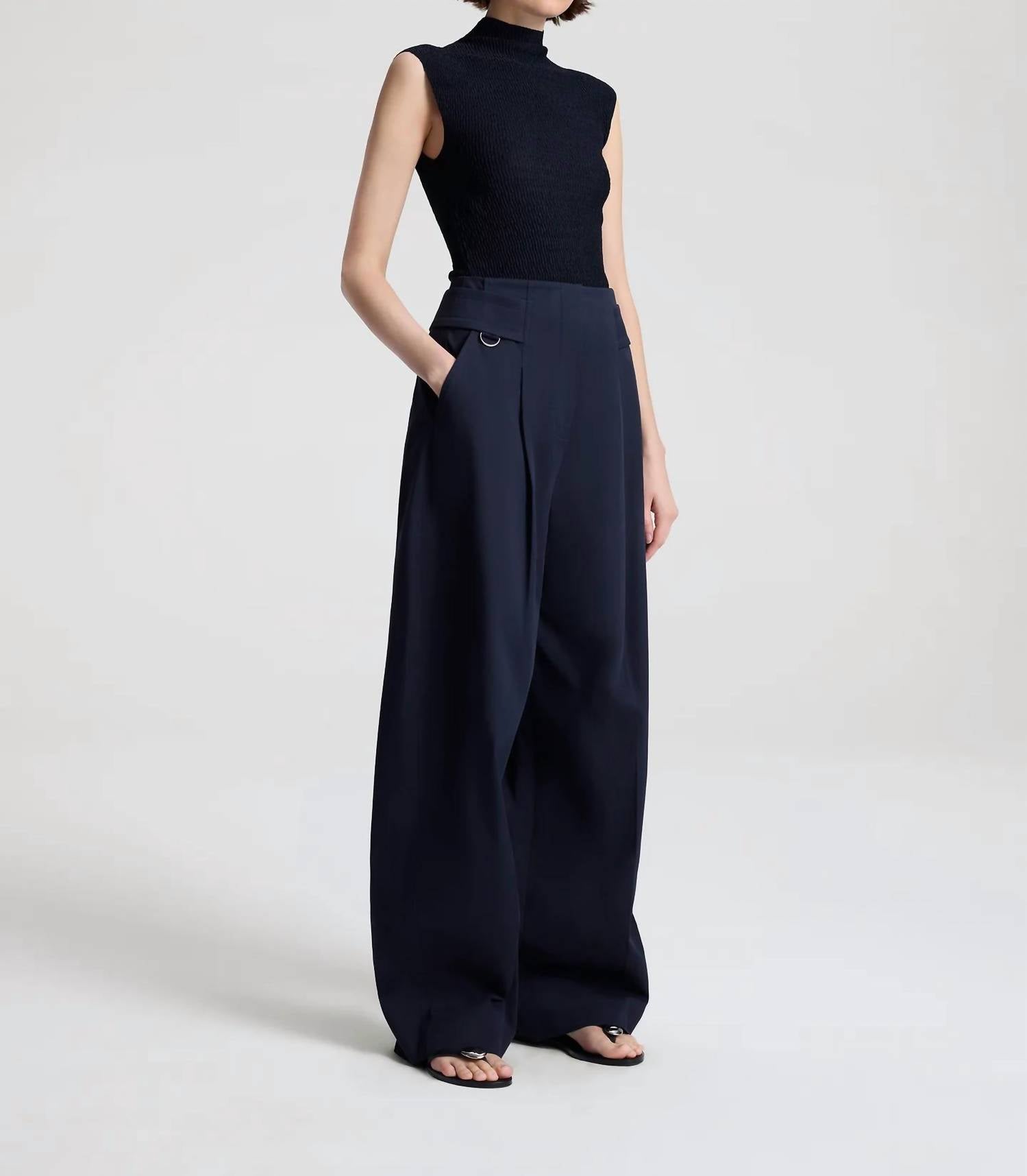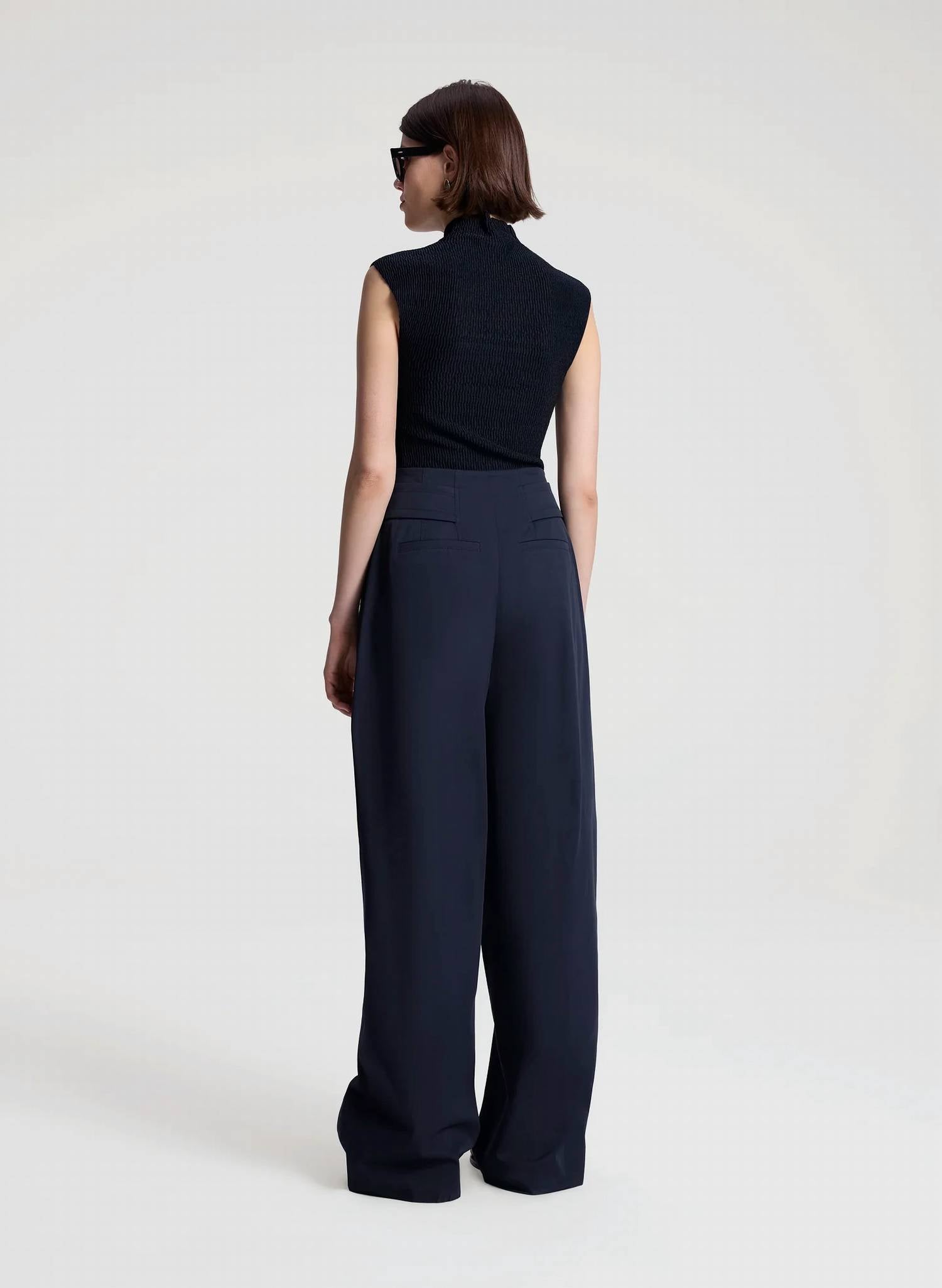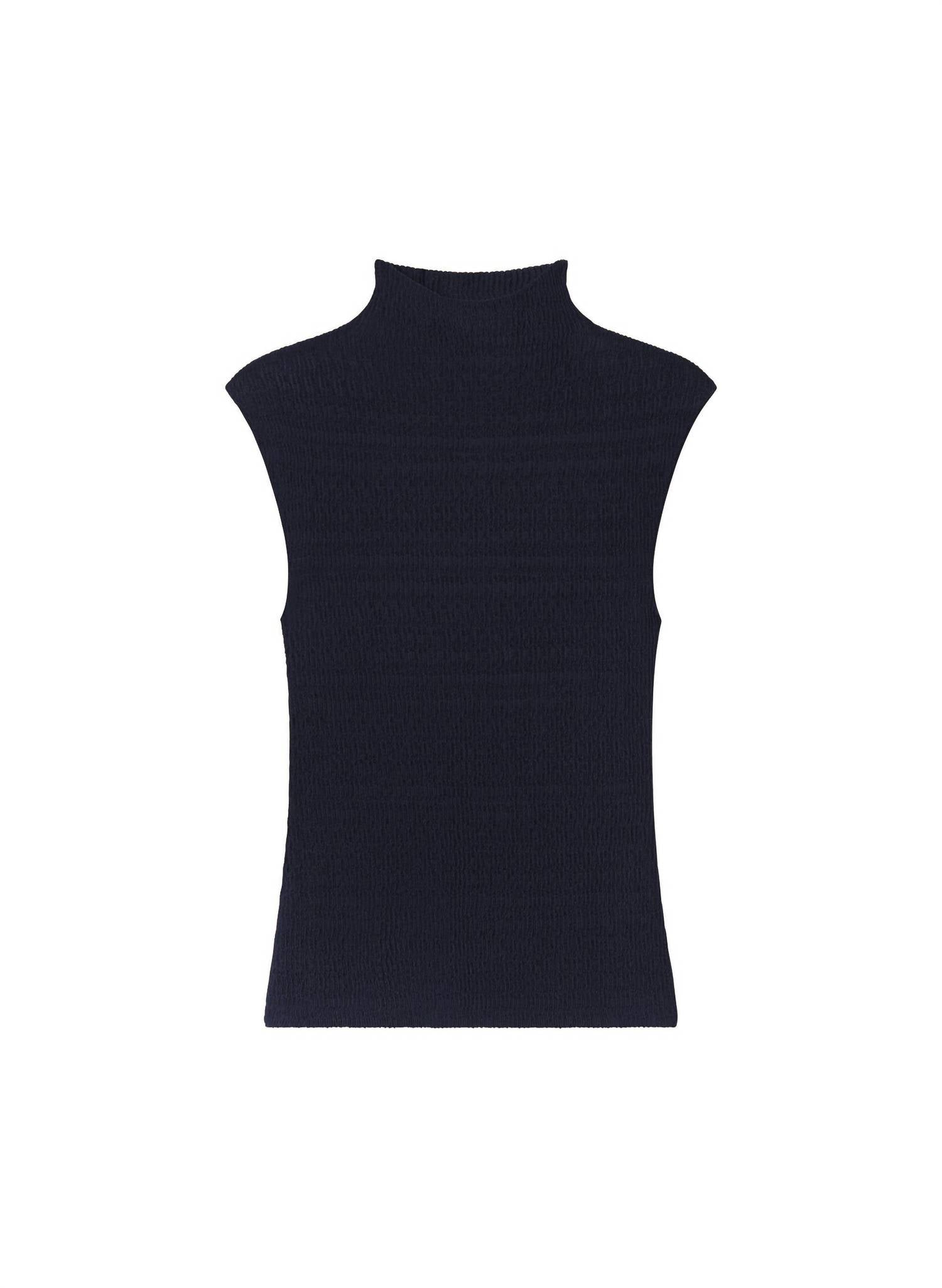 he Jada Top is crafted from a softly structured knit with a finely crinkled texture in a rich navy hue. This sleeveless silhouette features a sculptural mock neck and a second-skin fit that skims the body with gentle stretch.
