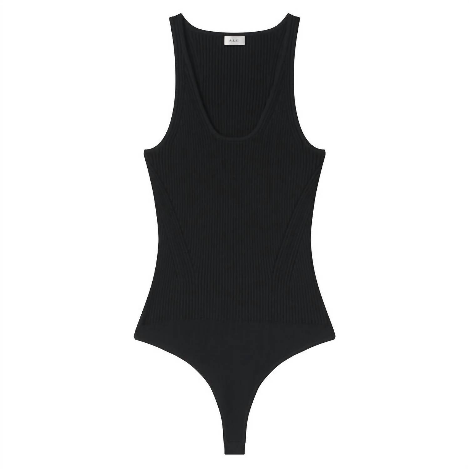 Pair this number with your favorite high-waisted jeans. Introducing the Lucy Bodysuit by A.L.C., a minimalist staple crafted in classic black. This sleeveless bodysuit is crafted from a pointelle rib fabric composed of 60% Viscose, 39% Nylon, and 1% Elastane for a second-skin fit. It features a scoop neck and modern racerback design. Closure is provided by a discreet snap, and the garment is dry clean only, ensuring it maintains its sleek aesthetic season after season.