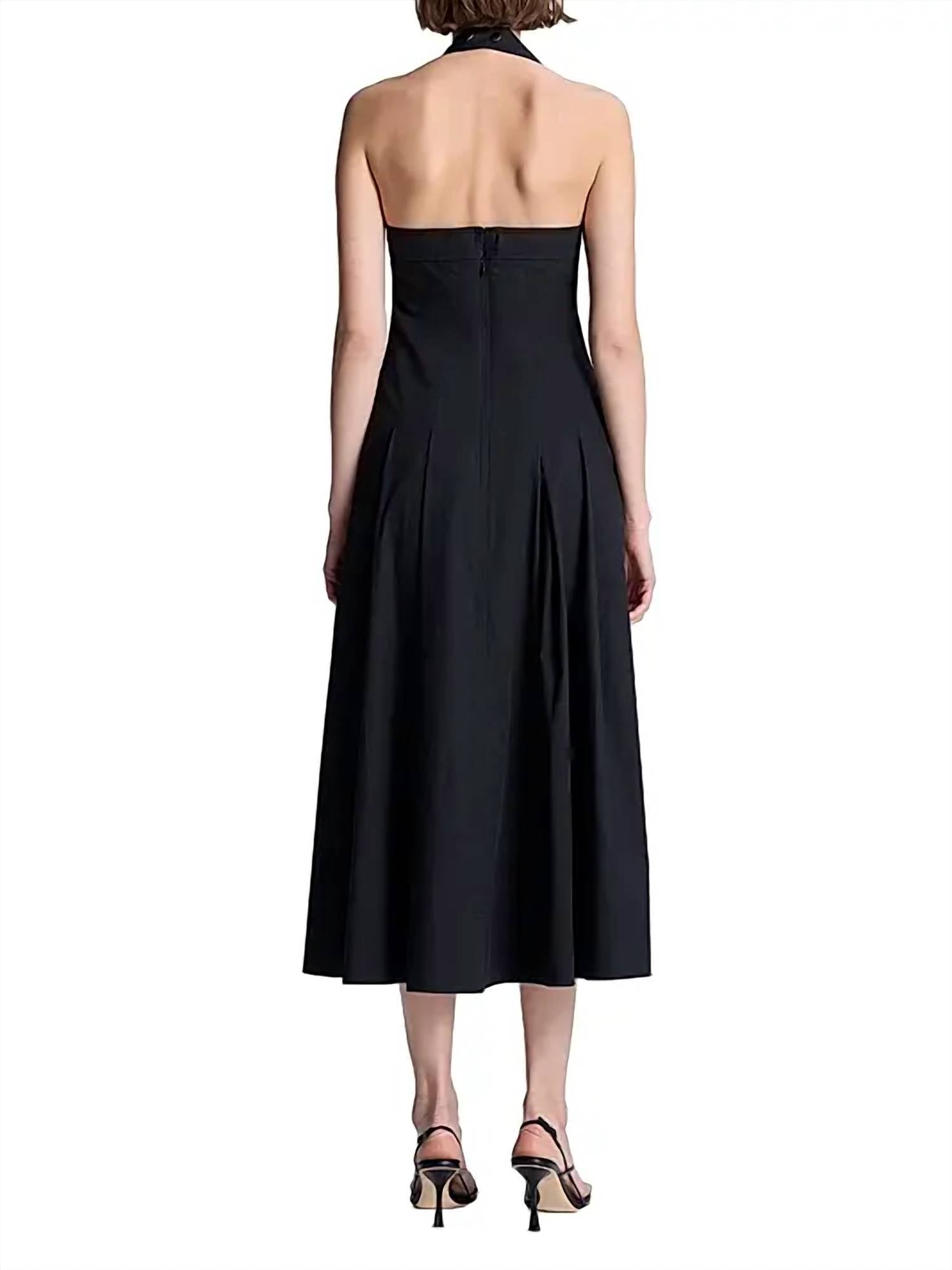 Unveil sophistication with the Natalie Halterneck Midi Dress by A.L.C., a quintessential piece for minimalist elegance in black. This sleeveless dress boasts a square halter neckline and a flattering A-line silhouette, meticulously crafted from a cotton blend with 97% cotton and 3% elastane for stretch. Finished with both a back zip and snap-back closure, it is imported and offers the convenience of dry clean care. Ideal for spring, this versatile dress features pockets and is designed for a chic holiday party look. Model wears a size small and is 5'10" tall.