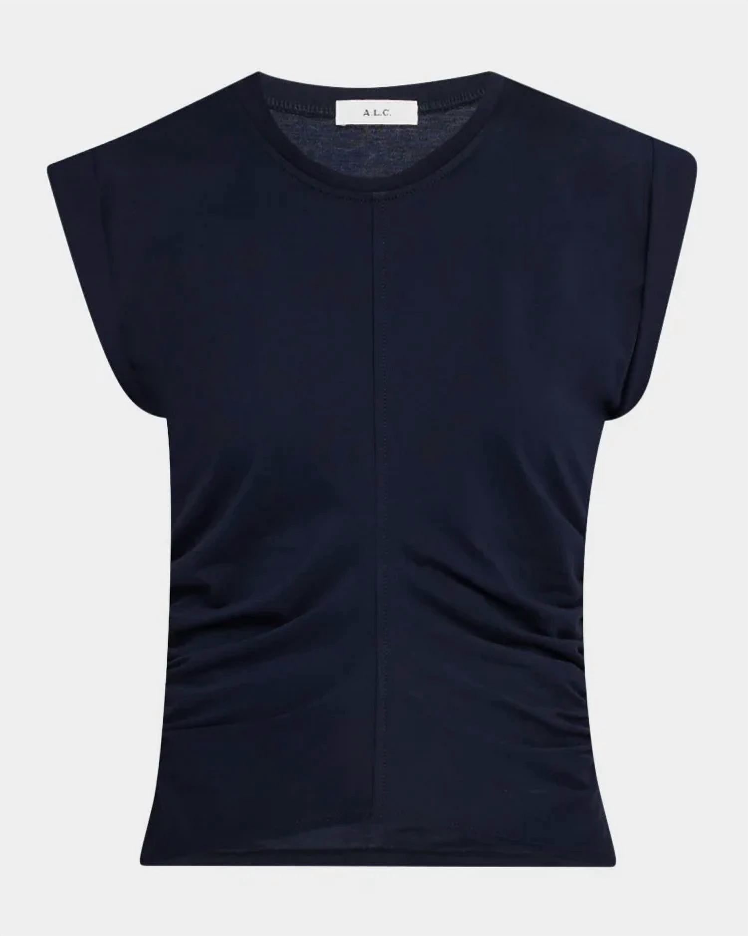 Elevate your everyday wardrobe with the Nia Tee by A.L.C. in Maritime Navy. This sleeveless tee is crafted from 100% cotton with a clean-finish jersey that feels soft against the skin. It features rolled cap sleeves, side ruching, and a front seam, creating a structured silhouette with a length of 17.875". Closure: Pull on. Model is 5'9.5" and is wearing a size S (Bust 30.5", Waist 23", Hips 34").