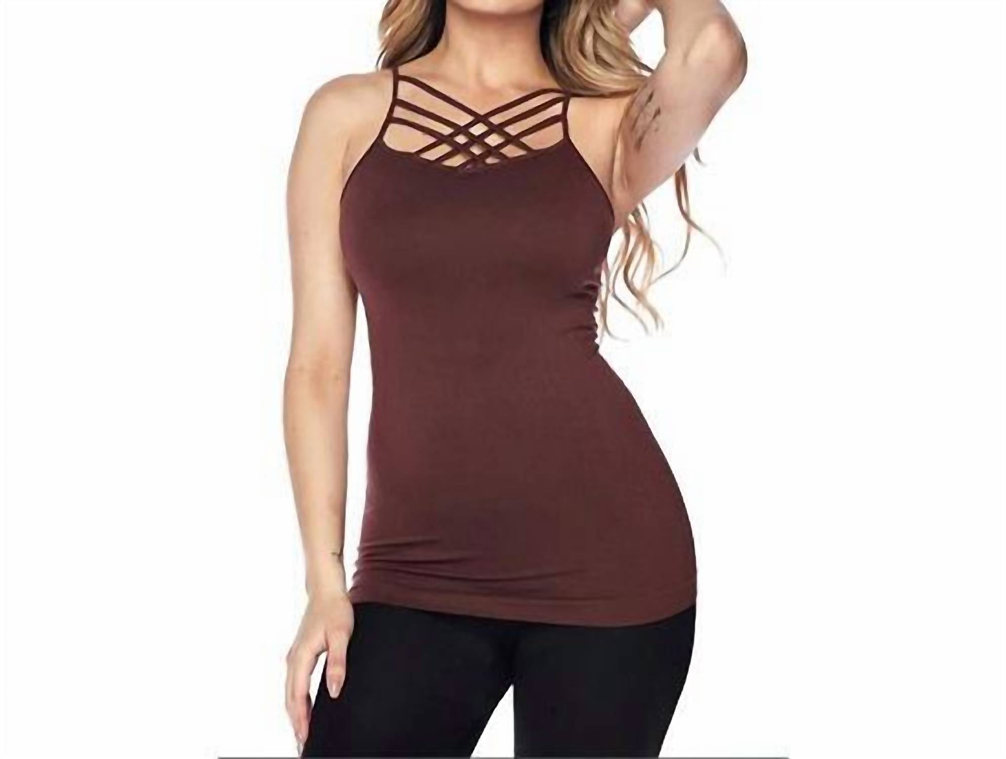 Elevate your wardrobe with AAAAA FASHION's Triple Criss-cross Cami Top, a chic addition in a sophisticated brown hue. This sleeveless cami features a stylish triple criss-cross strap design and a flattering scoopneck, perfect for solo wear or layering. Made from a soft, stretchy blend of 92% nylon and 8% spandex, it offers a comfortable, curve-hugging fit. Closure: Pull-on. Care: Hand wash. Measurements for size S/M: Approximately 21-inch body length, 26-inch chest.