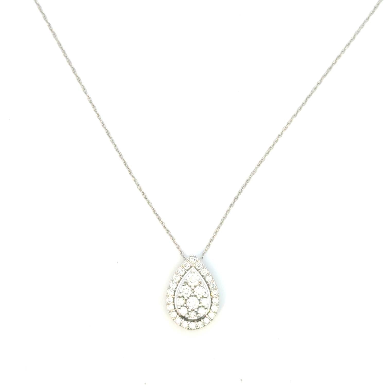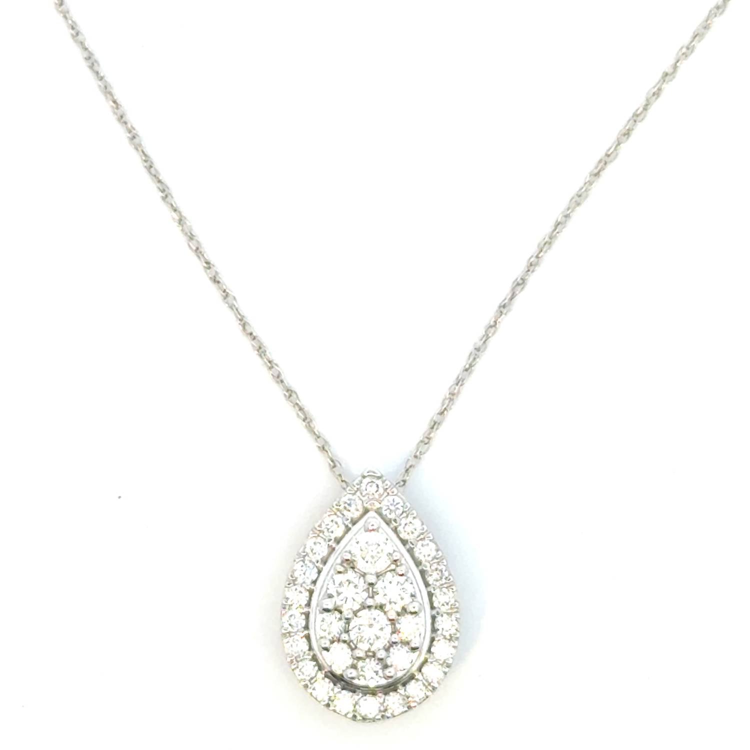 Elegant pear-shaped pendant featuring 0.53 carat of natural round brilliant cut diamonds in a sophisticated cluster design. The center cluster of round brilliant diamonds is surrounded by a sparkling pear-shaped halo, creating a graceful teardrop silhouette. Crafted in 14k white gold (2.00 grams) with secure prong settings that maximize light reflection. This timeless design offers classic elegance perfect for special occasions or adding sophistication to everyday wear. Key Features: 0.53 total carat weight natural diamonds. Round brilliant cut diamonds throughout. 14k white gold construction (2.00 grams). Pear halo setting with cluster center. Classic teardrop pendant design. Perfect for layering or wearing alone.