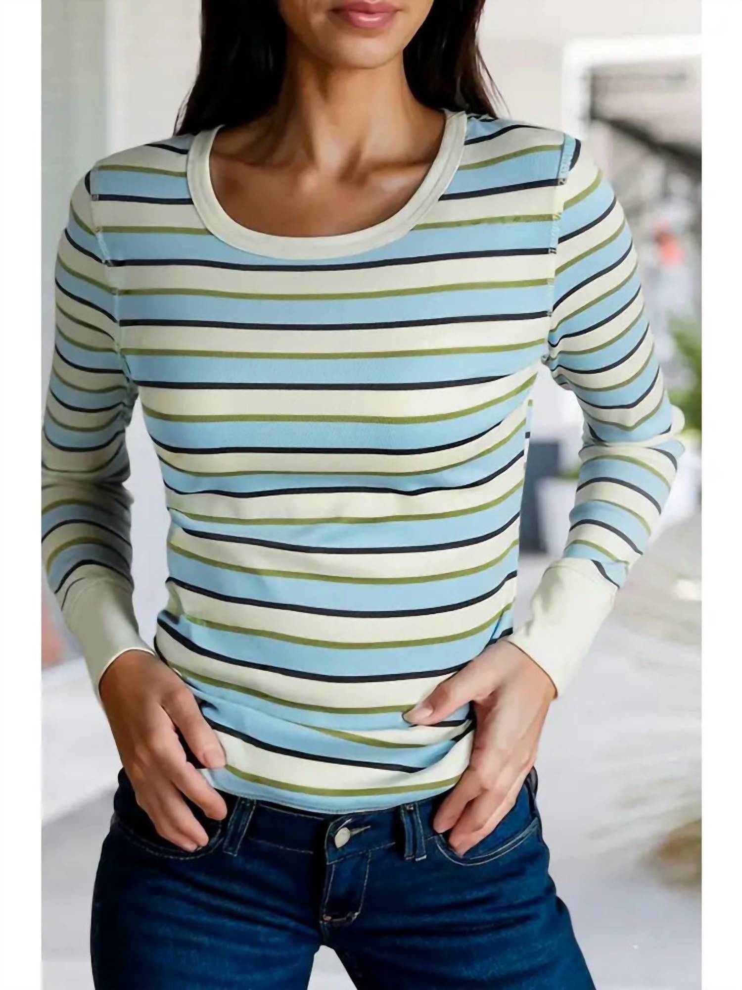 Great fit, cute design, soft fabric. You'll love everything about this long sleeve tee. Elevate your wardrobe with the Cassie Striped Long Sleeve by Aapparella, a chic addition for effortless layering. This women's crewneck top features a classic striped pattern in a Blue Multi hue, perfect for a put-together look. Sleeve Length: Long Sleeve. Closure Type: Pull On. Care: Hand wash, line dry.