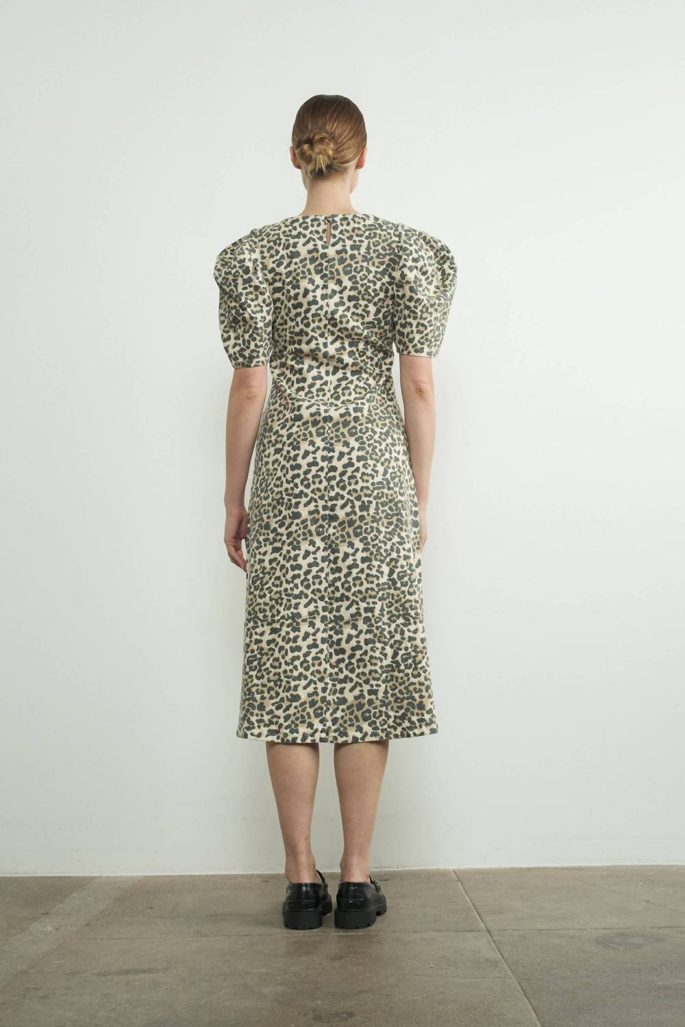 Introducing the Aaron & Amber Puff Sleeve Midi Dress, a statement piece in a captivating animal print perfect for your next holiday party. This dress boasts short sleeves, made from a cotton blend for comfort, and features a flattering A-line silhouette that falls to a midi length. It includes a crewneck and a playful keyhole at the back, secured with a button closure. To keep this maximalist piece in top condition, hand wash and line dry.