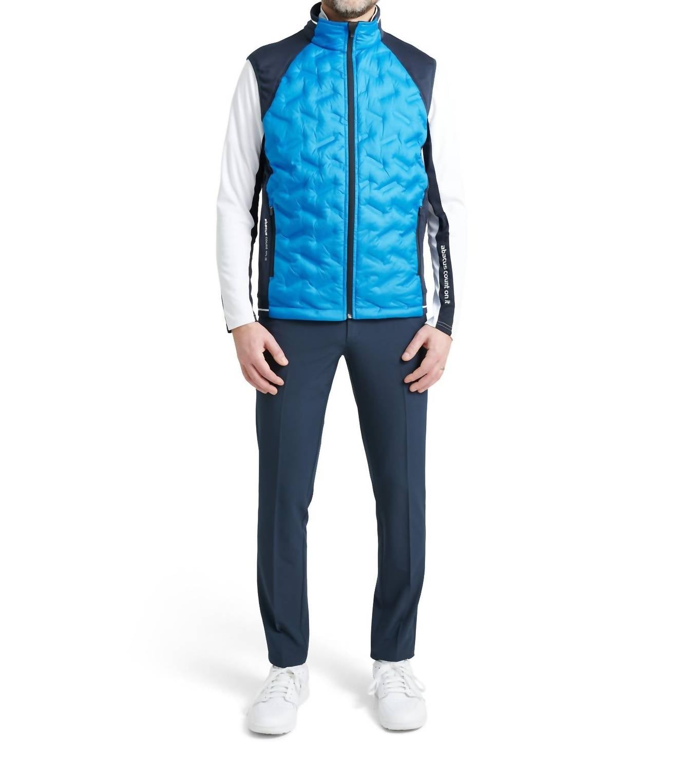 Stay warm and mobile with the Abacus Sportswear US Grove Hybrid Vest in ocean. This sleeveless vest combines windproof quilted fabric and breathable brushed fleece for optimal warmth and flexibility. Crafted from polyester, it features a full-zip closure and zippered pockets for secure storage. Adorned with a contrast stripe at the hem and collar, and the Abacus logo for a stylish finish, this patterned vest is a winter essential.