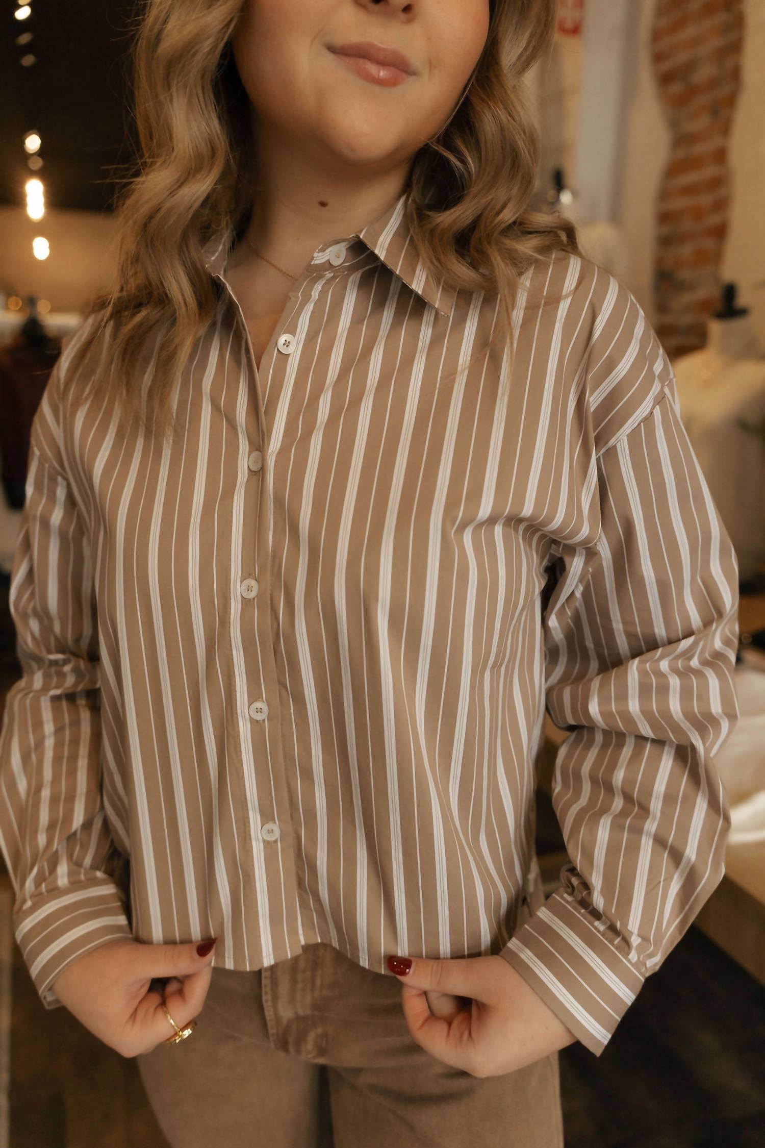Meet the Crop Striped Shirt by ABLE, a chic mocha piece perfect for your spring wardrobe. This women's workwear staple features long sleeves and a classic collar, perfect for professional and casual settings alike. Designed with a stylish stripe pattern, it offers a button closure for ease of wear. Ideal for engagement events or Easter gatherings, this shirt promises versatility and elegance.