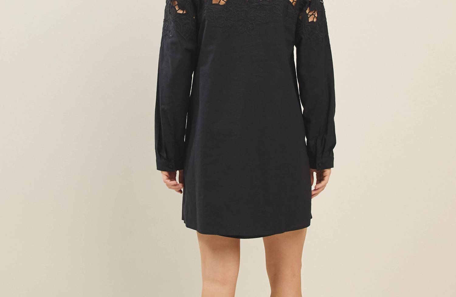 Unveil your chic side with the Cutwork Embroidered Mini Dress by ABLE, an impeccable choice for New Year's Eve celebrations. This vintage-inspired shift dress boasts three-quarter sleeves adorned with intricate embroidery and cut-out details. Designed in a classic black hue, the dress features a mockneck and a convenient button closure. For care, hand wash and line dry to maintain its delicate design.
