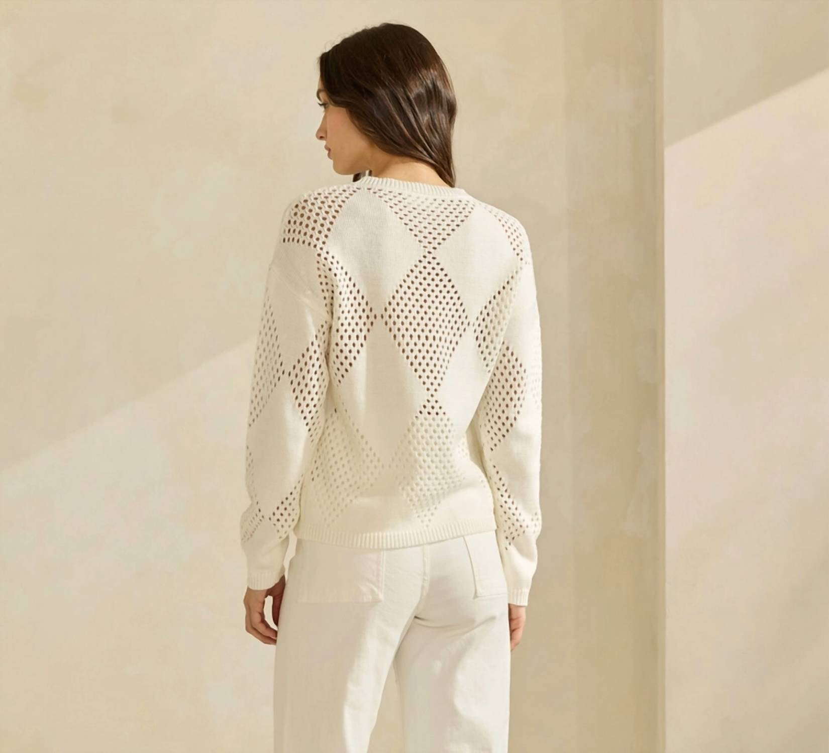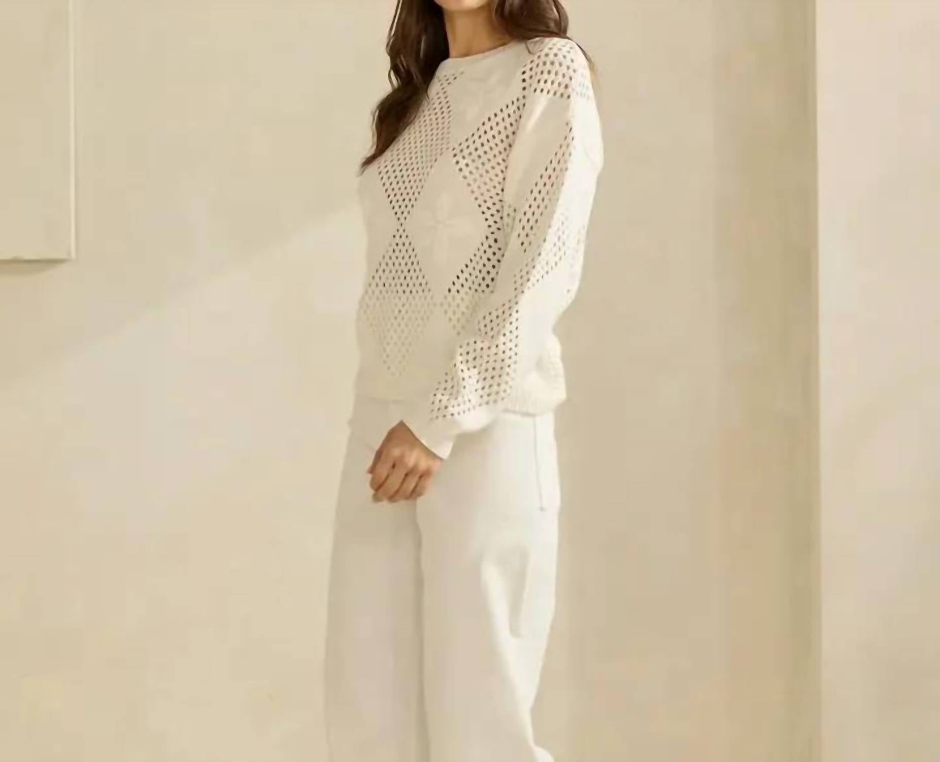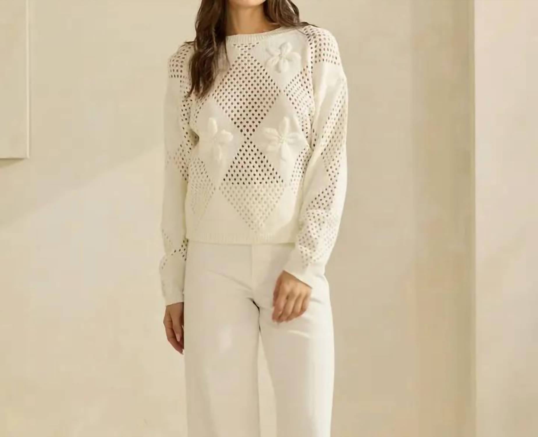 Mantenha-se aquecido e estiloso com esta peça essencial de tricô versátil e despojada. Use-o sozinho ou em camadas, é o suéter perfeito para a estação e você vai desejar tê-lo em todas as cores. Apresentamos o suéter bordado com flores vazadas da ABLE, uma peça elegante na cor creme, perfeita para qualquer ocasião primaveril. Com mangas compridas e um charmoso padrão de losangos, este suéter de gola redonda combina elegância e conforto com naturalidade. Sua composição de 55% acrílico e 45% algodão garante um toque macio e durável. Para um cuidado duradouro, lave à mão com água fria e pendure para secar. A modelo veste tamanho P (1,72 m).