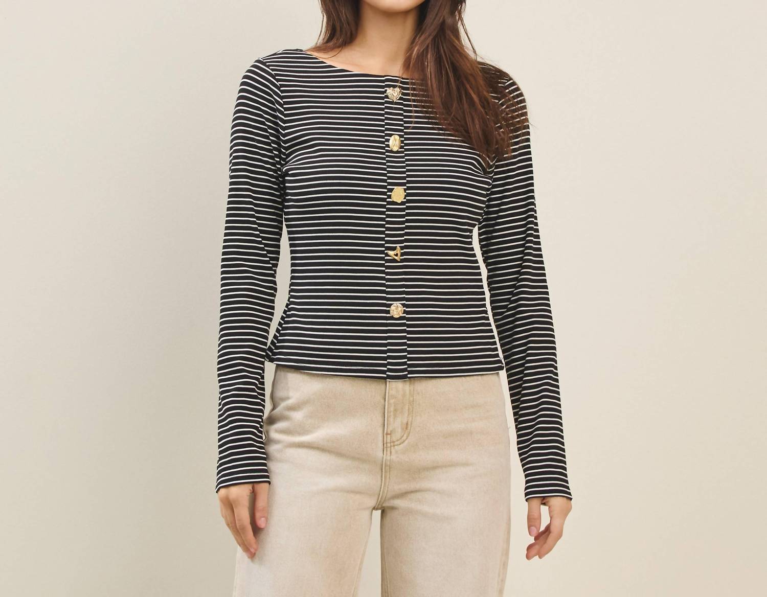 Elevate your vacation wardrobe with the ABLE Jewel Button Stripe Top, a chic nod to 90s fashion. Featuring long sleeves and a sophisticated boatneck, this top showcases a timeless black stripe pattern. Closure: Button closure. Perfect for spring outings and effortlessly stylish without the need for pockets.
