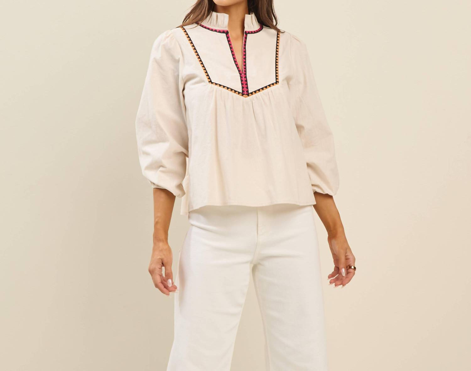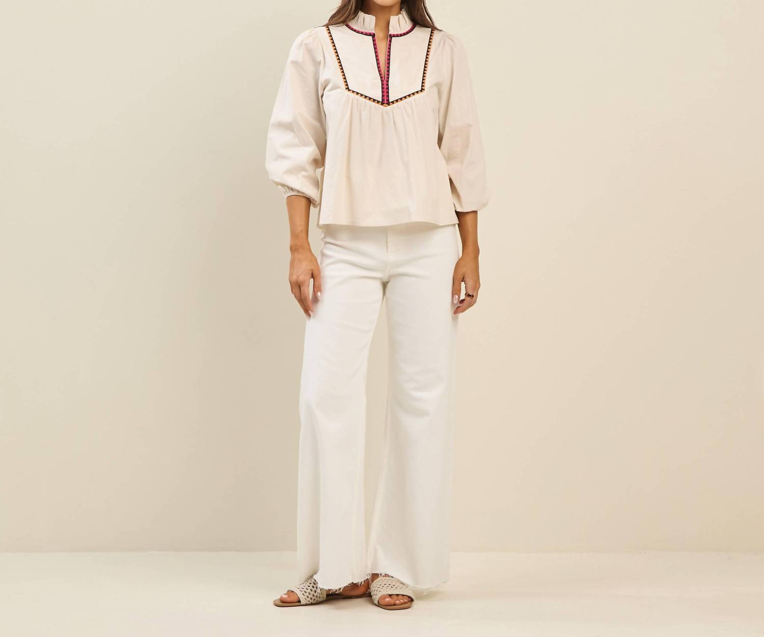 Meet the Sophia Embroidered Top by ABLE, a stunning blend of artistry and elegance. This women’s blouse in ecru features a charming V-neck complemented by three-quarter sleeves, perfect for a holiday party. Crafted from quality cotton, its solid pattern and pull-on closure ensure both style and comfort. While washing and drying instructions are not specified, this blouse is an investment in timeless fashion versatility.