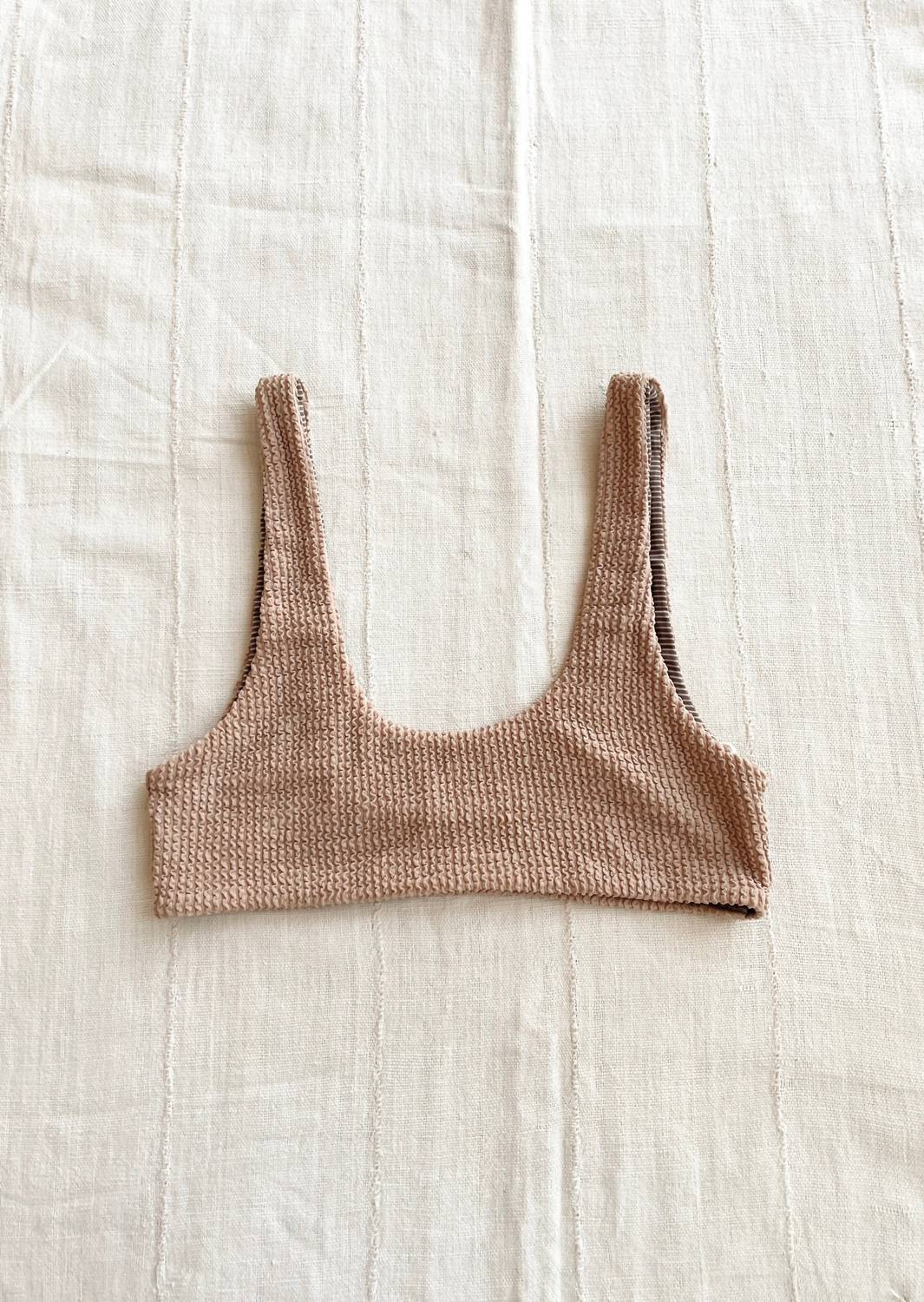 Dream of your next beach getaway in this cute little number. Pair with strappy sandals, a floppy hat, and an oversized tote to complete the perfect vacation look. Introducing the Birdie Scrunch Top by ACACIA, a chic swim top in a beautiful, muted tea color, designed for your perfect summer escape. This bralette style features fixed straps, offering classic coverage with a soft and body-hugging fit. Made from 80% recycled nylon and 20% spandex, it's crafted for comfort and style. Care: Hand wash cold, lay flat to dry; please avoid rough surfaces, lotions, sunscreens, and overly chlorinated pools. Model in the images is gracefully styled in a size small (5'9" height, 34" bust).