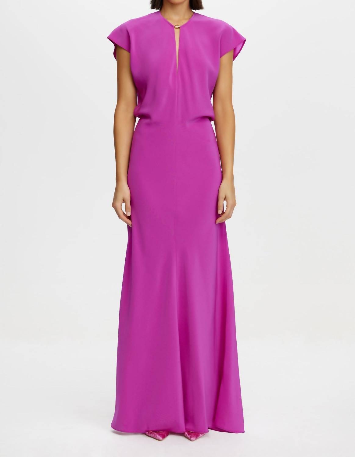 A maxi dress that is just as cute as it is comfortable. Introducing the Yarrow Maxi Dress by ACLER, a sophisticated choice for any evening event. This elegant dress in Amethyst features cap sleeves and a chic crewneck with polished hardware detailing at the front neckline. Crafted from a luxurious matte woven material composed of 76% Acetate and 24% Polyester, its bloused bodice gracefully transitions into a straight skirt silhouette. The design is completed with an invisible zip closure at the back for a seamless finish. Model is 5'9" and is wearing size AU 8 / US 4.