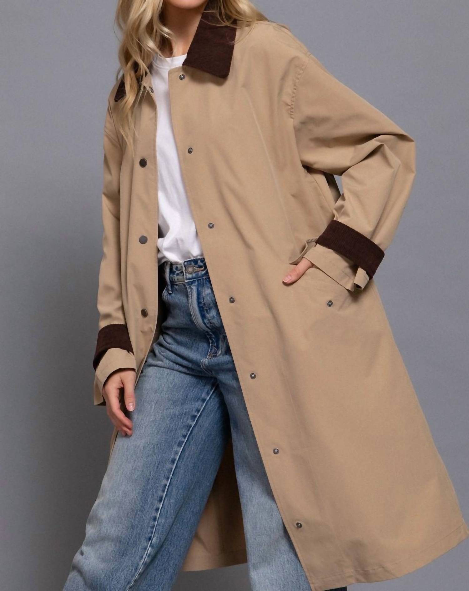 Classicly chic, this is the kind of trench coat that never goes out of style. Elevate your outerwear collection with the Contrast Collar Long Trench Coat by Active USA, perfect for a winter dinner party. This khaki coat features long sleeves and a striking contrast collar, finished with a convenient snap closure and functional pockets. Crafted from 100% polyester, it embodies minimalist style with a solid pattern. Ideal for women who appreciate fashionable practicality.