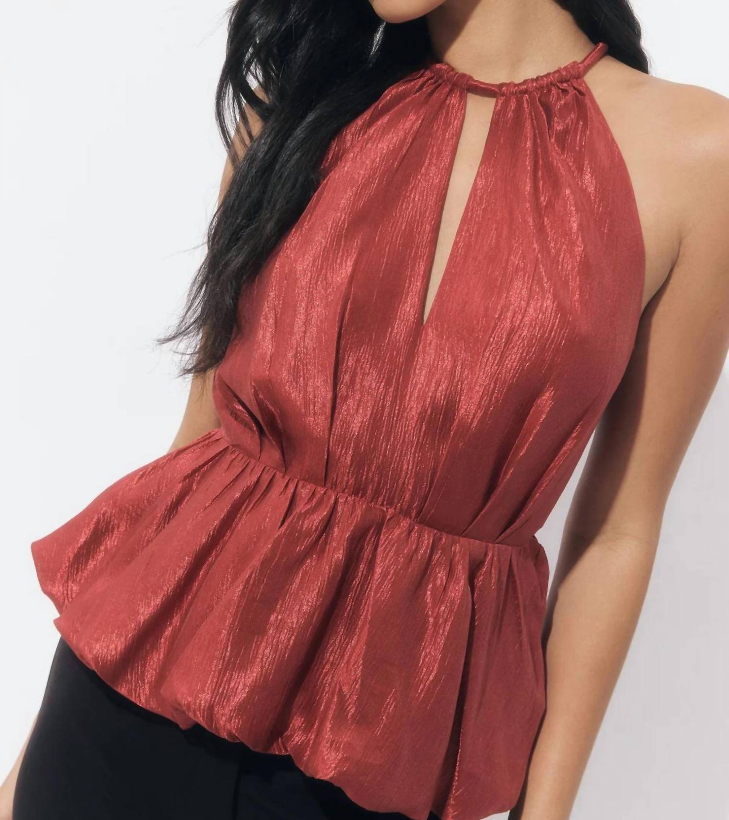 Introducing the Lidia Textured Halter Top by Adelyn Rae, a sophisticated piece in a rich dark rust color. This sleeveless blouse is crafted from lightweight polyester, perfect for both professional and evening wear. Featuring a flattering halter neckline with a functional tie closure at the back, it's designed to impress. Care for this elegant piece with hand washing and lay it flat to dry.