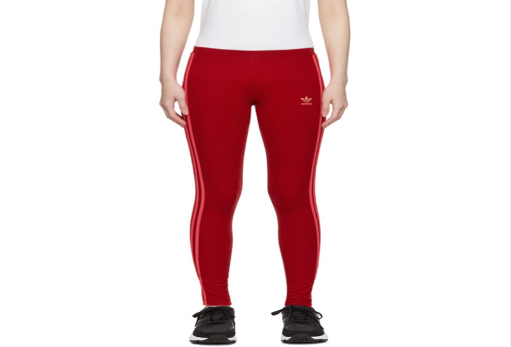 Calças justas femininas Adidas Lifestyle, cós elástico, logotipo Trefoil da Adidas na perna, marca das 3 listras nas laterais, tecido de algodão elástico para máximo conforto, ajuste firme; tecido 93% algodão, 7% elastano | Calças justas Adidas 3 listras em vermelho, tamanho XS | algodão | Jimmy Jazz